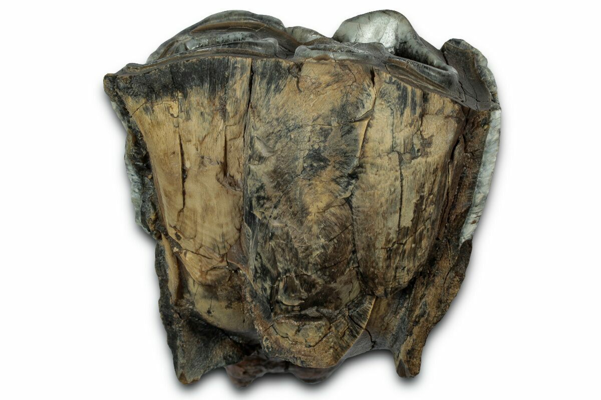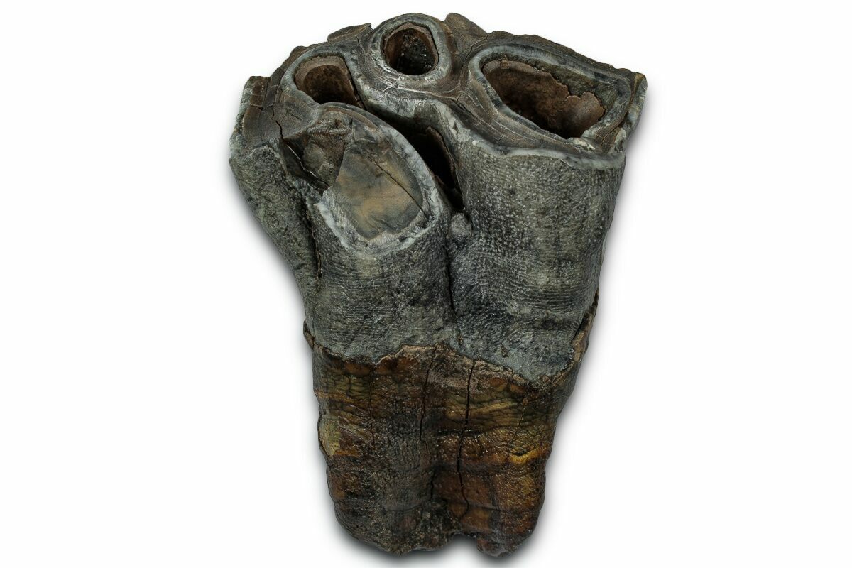 This is a fossil tooth from a woolly rhinoceros (Coelodonta antiquitatis). This fossil comes from Siberia, Russia, where many woolly mammoth and woolly rhino fossils are unearthed. About 25% of the tooth is missing. Including the root, the tooth measures 3" tall.