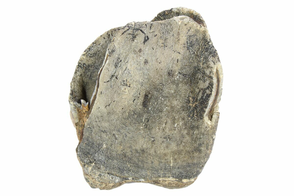 This is a well preserved fossil tooth crown from the upper jaw of a woolly rhinoceros (Coelodonta antiquitatis). The enamel is very well preserved, with black-grey tones coating most of the crown. This fossil comes from Siberia, Russia, where many Woolly Mammoth and Rhino fossils are unearthed. The tooth measures 3" tall.