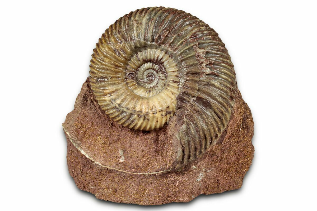 This is a beautiful, 3" wide ammonite (Parkinsonia sp.) fossil from the Parkinsonien-Oolith within the Berching Subformation (Sengenthal Formation) of Germany. This Jurassic-aged ammonite has been carefully exposed from the rock it was found in. The base of the rock has been cut flat for presentation.