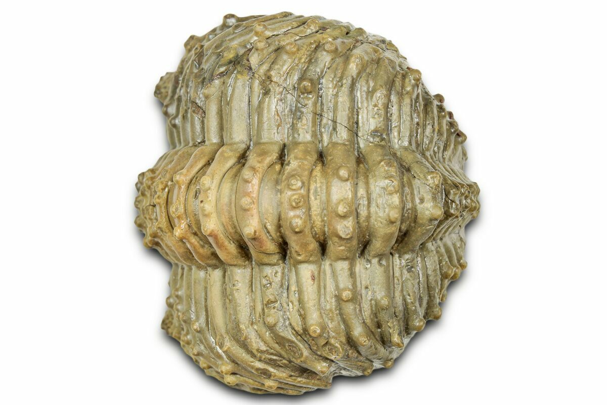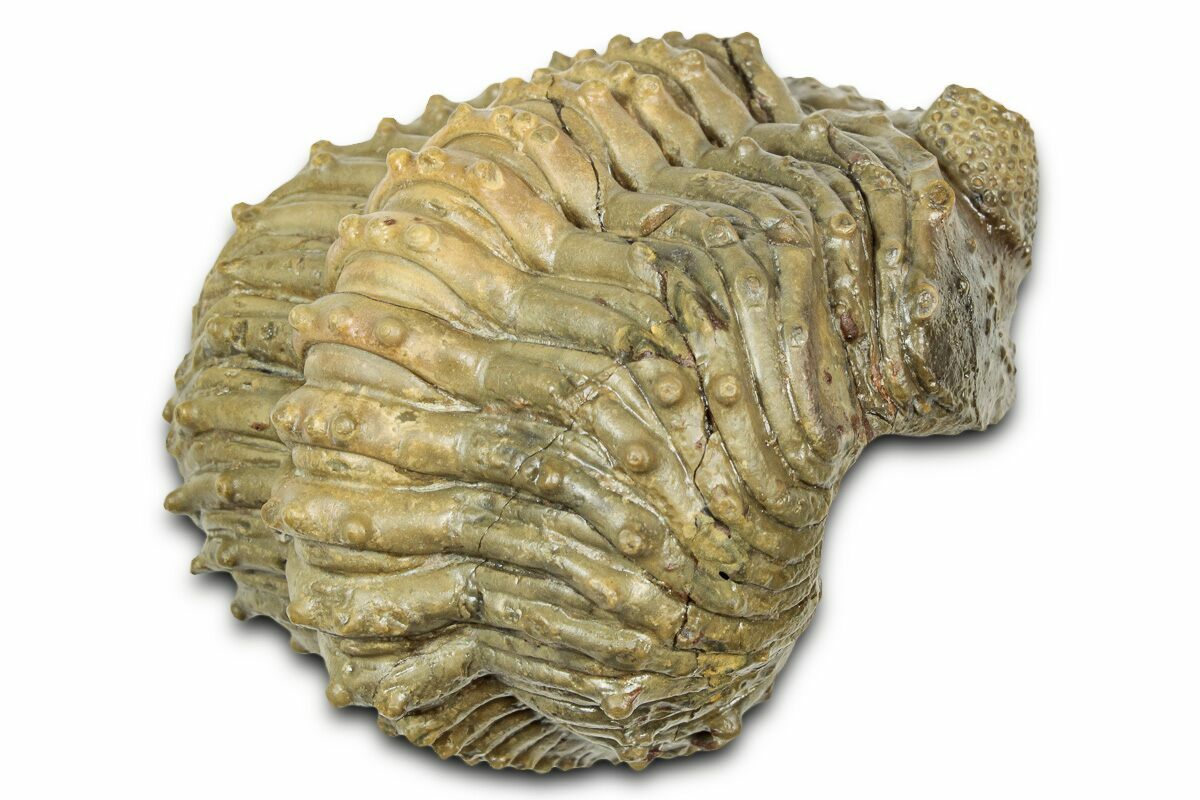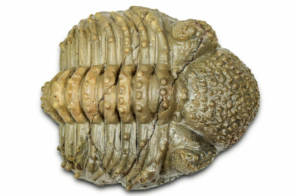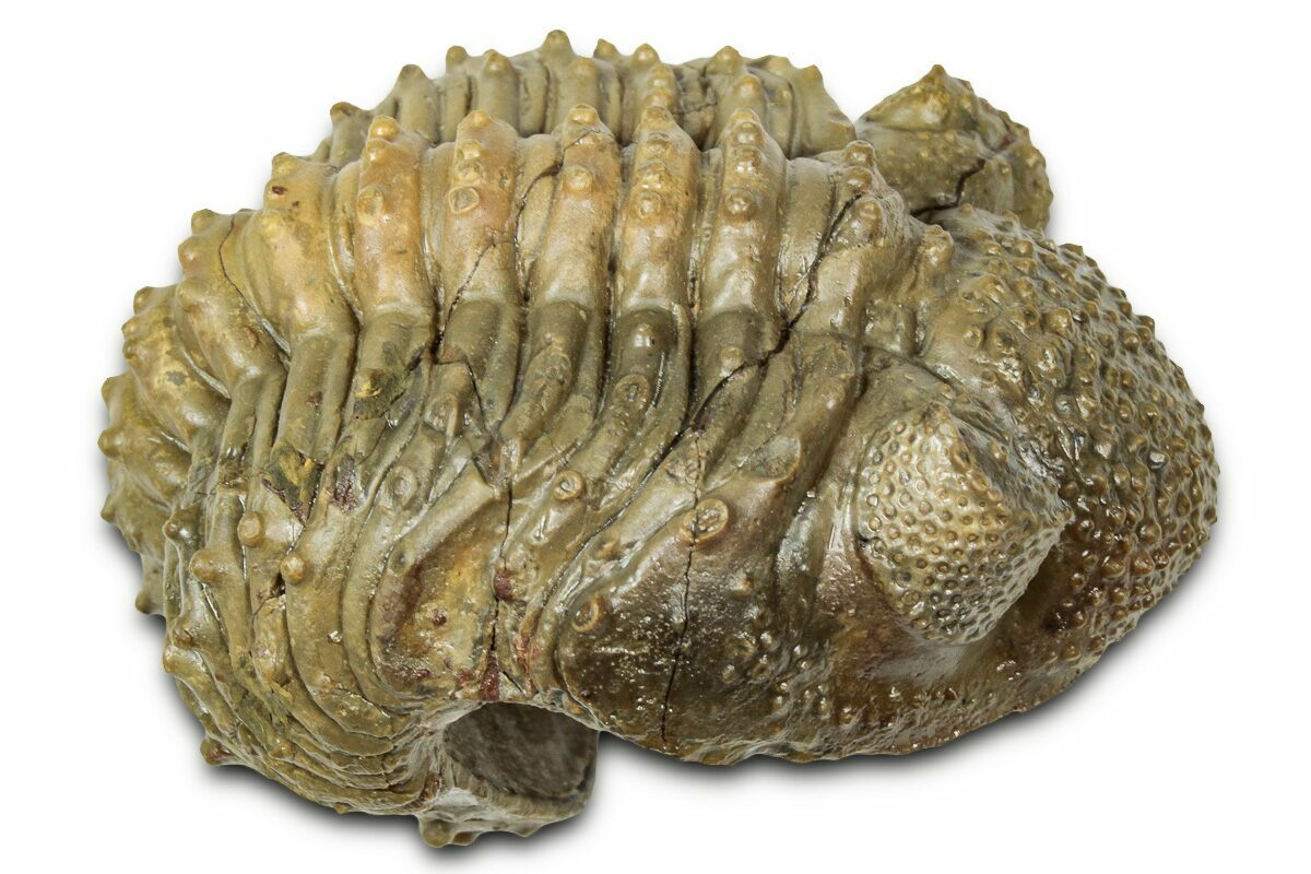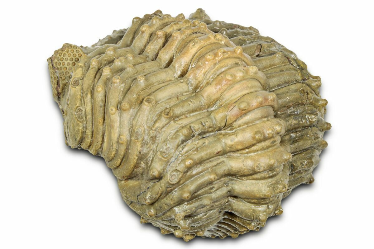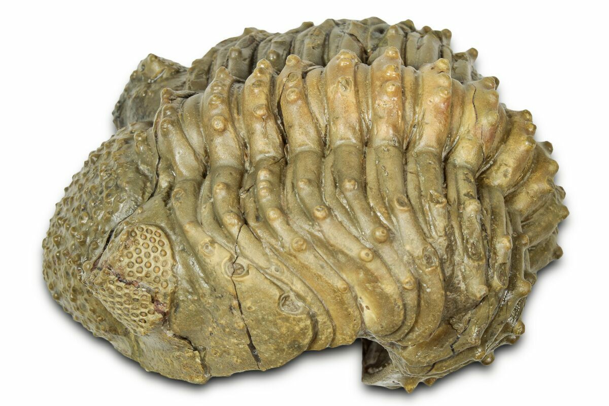 This is a partially enrolled specimen of the phacopid trilobite Drotops armatus. Typically these D. armatus trilobites are covered in nearly 100 spines but in this specimen they are all broken off near their base. Excellent eye facet preservation and as a bonus the hypostome (mouthplate) has been exposed on the underside of its head.