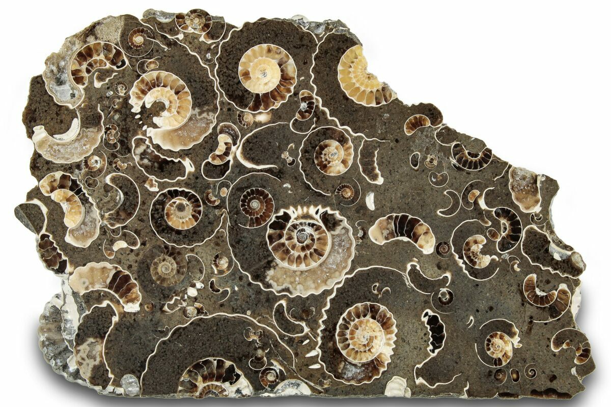 The site that produces this material is no longer accessible. Because of this, these specimens are becoming increasingly harder to obtain. The piece has been painstakingly prepared with mechanical tools to expose all of the individual ammonite fossils on the back of the specimen.