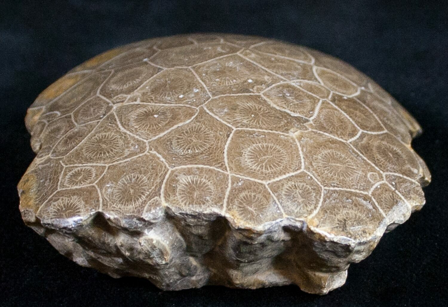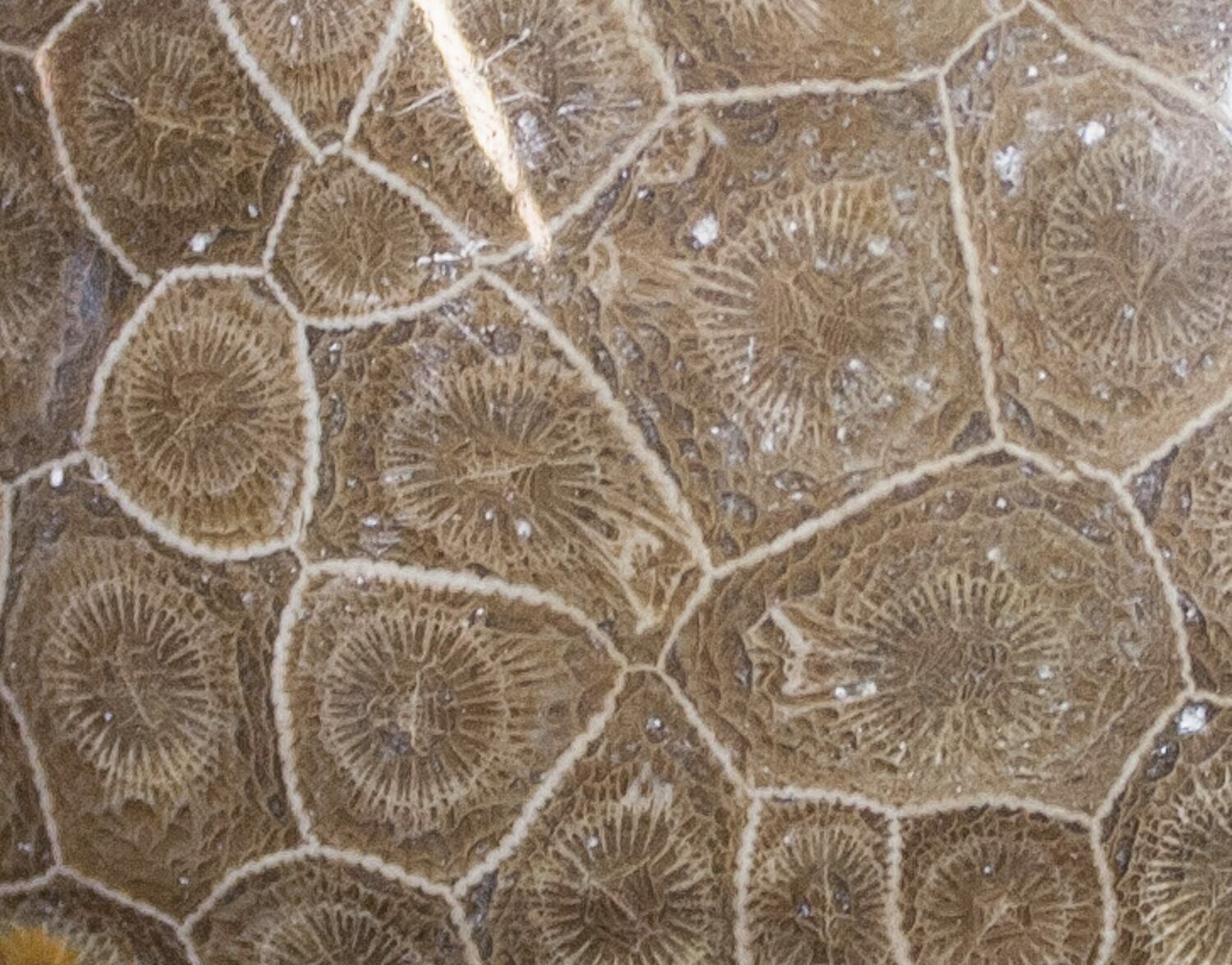 This is a beautiful piece of fossil coral collected near Assa Zag, Morocco in the Western Sahara. It is Early Pennsylvanian in age, or approximately 320 million years old. The polishing shows off the beautiful inner structure of the coral colony beautifully. It looks very similar to the fossil coral "Petoskey stones" found in Michigan, though these are a different genus of coral.