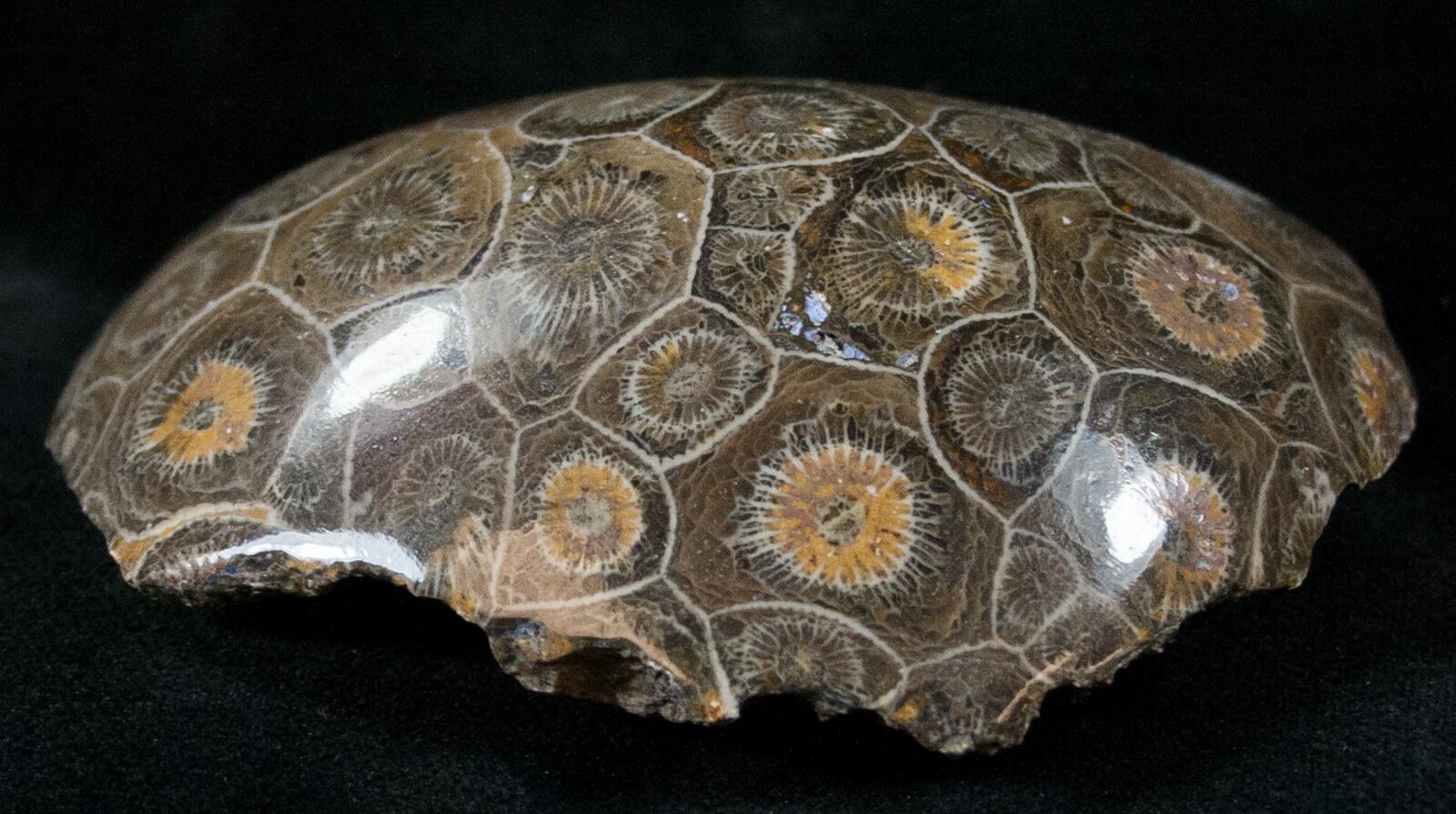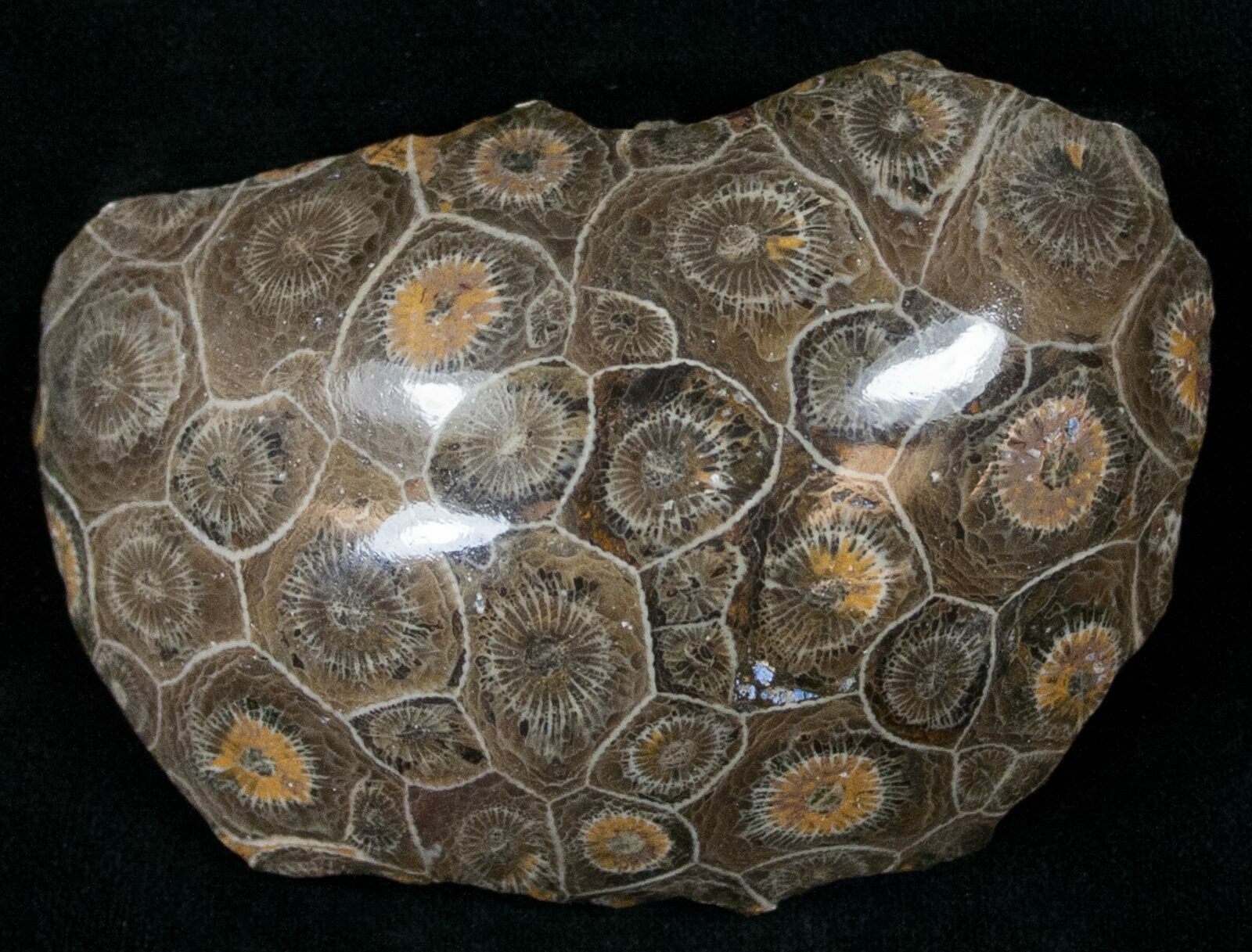 This is a beautiful piece of fossil coral collected near Assa Zag, Morocco in the Western Sahara. It is Early Pennsylvanian in age, or approximately 320 million years old. The polishing shows off the beautiful inner structure of the coral colony beautifully. It looks very similar to the fossil coral "Petoskey stones" found in Michigan, though these are a different genus of coral.