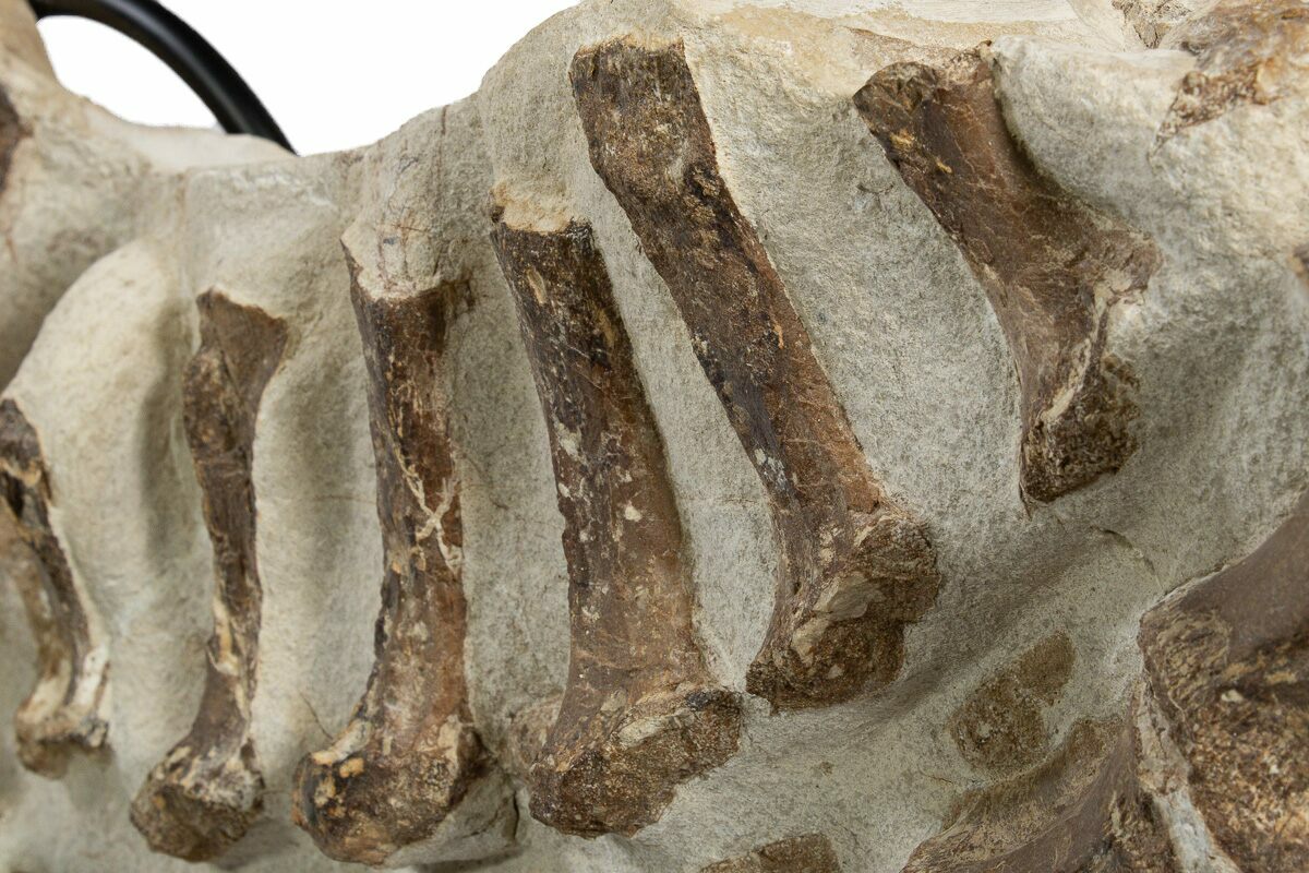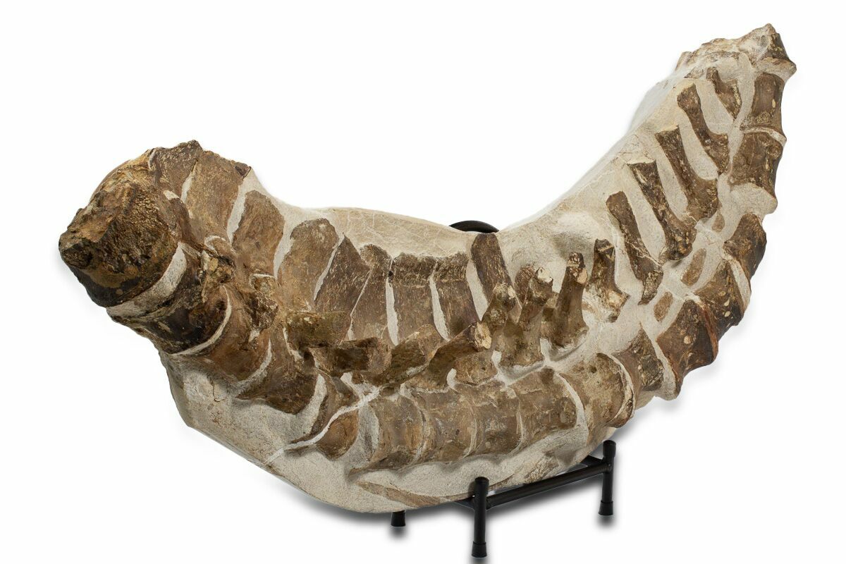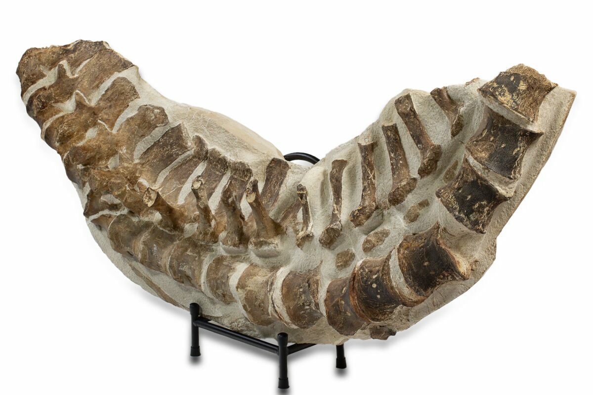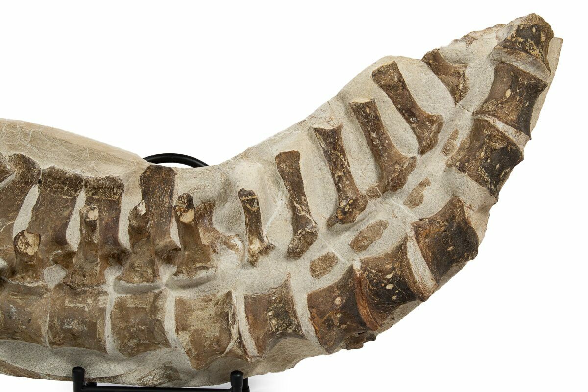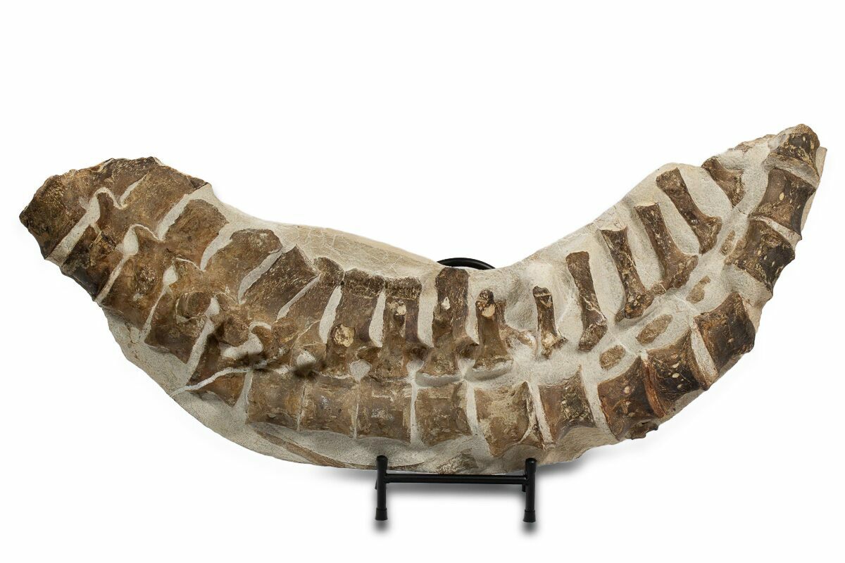 This is a section of rock that contains a string of 17 fossil plesiosaur dorsal vertebrae, collected from the Upper Cretaceous (Early Turonian Stage) deposits of Asfla, Morocco, north of Goulmima. They are all well preserved in articulated fashion and feature intact processes. The entire specimen measures 30 x 8.8 x 5" and is accompanied by a metal display stand.