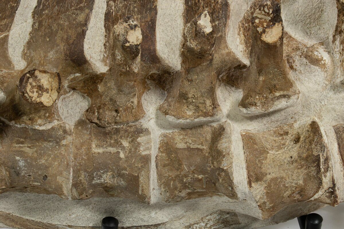The vertebrae have not been repositioned or adjusted, but instead have been exposed from the rock they were found in. The spinous processes, transverse processes, and centrums are all natural. Most of the completely exposed transverse processes have has some form of repair or gap fill restoration. The cross sections of the unexposed processes can be seen on the backside of the specimen.
