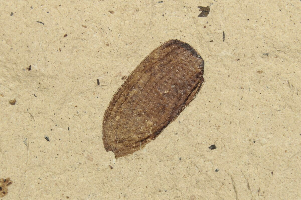 This is a .31" long beetle (order Coleoptera) elytron fossil, collected from the Oligocene-aged deposits of Bois d'Asson, France. An elytron (plural: elytra) is a hardened forewing/cover/sheath that protects the wing(s) of beetles. This is part of an old collection that we recently acquired.
