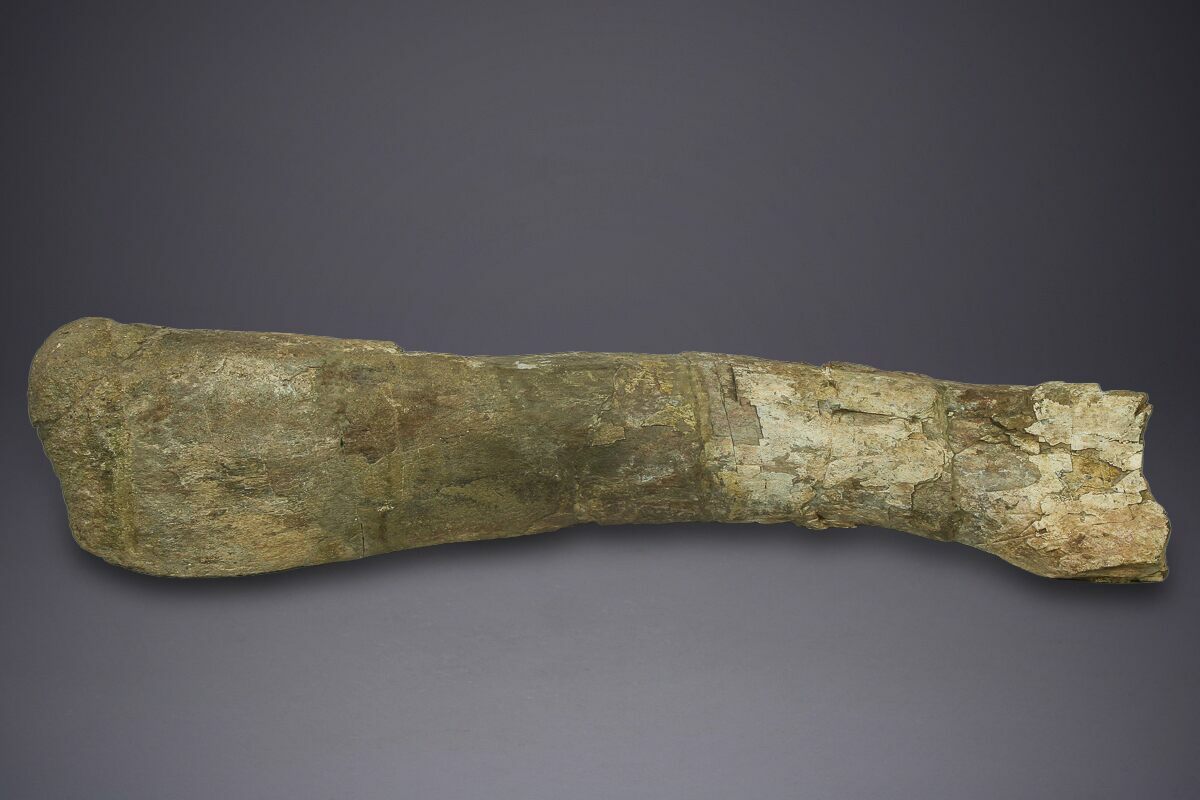 The bone is incomplete, with one of the epiphyses missing upon collection. It was found in multiple pieces, requiring some gap fill restoration along repaired cracks. There is no significant reconstruction restoration with only approximately 3% of the bone having been restored.