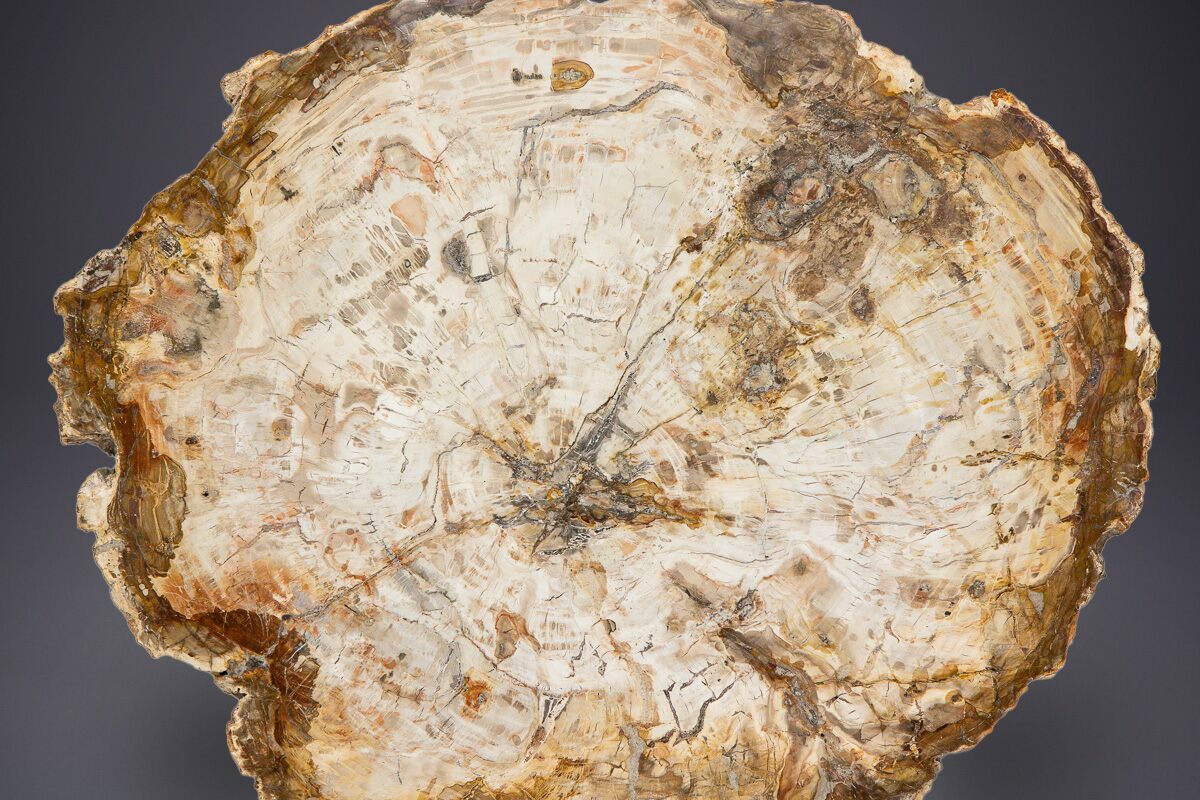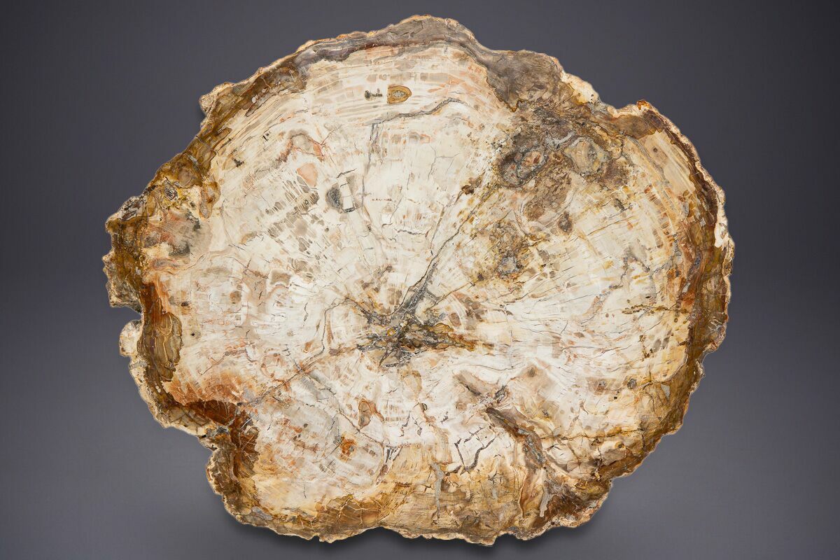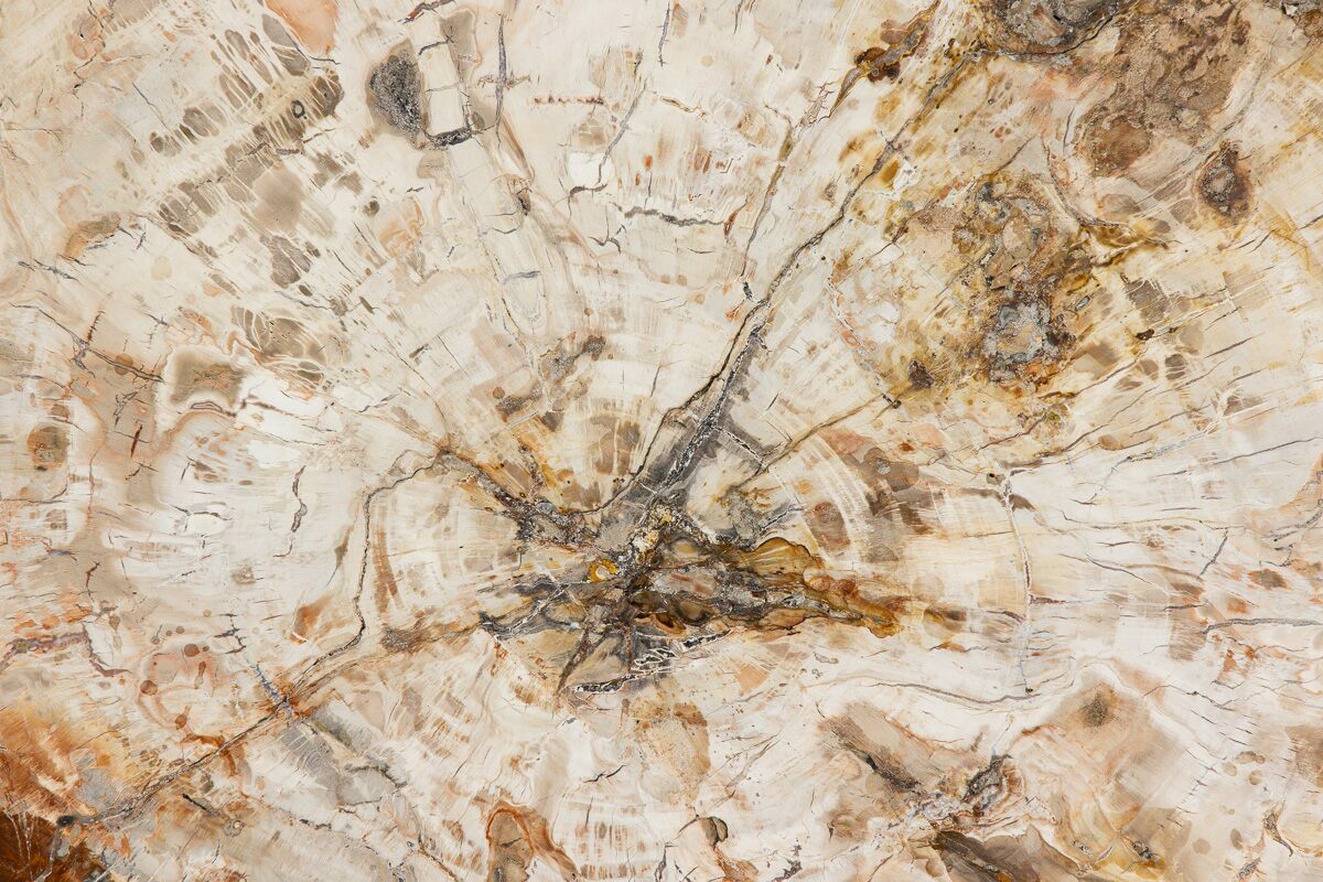 Madagascar petrified wood comes primarily from extensive Triassic-aged deposits in the Mahajanga Basin of northwestern Madagascar, where ancient conifer forests—often attributed to species related to Araucarioxylon—were buried by volcanic ash and floodplain sediments roughly 225–240 million years ago. Over immense spans of time, silica-rich fluids percolated through these sediments, replacing the cellular structure of the wood with chalcedony, jasper, agate, and quartz while preserving growth rings, bark textures, and even microscopic details. The region’s unique geochemistry—especially its iron, manganese, and occasionally copper content—produces the vivid palette Madagascar petrified wood is famous for, including deep brick reds, golden yellows, smoky blacks, and pastel pinks. Many logs are found fully silicified and naturally fractured into large, rounded segments that local artisans cut into slabs, spheres, eggs, and freeforms. These deposits stretch across arid badlands where erosion steadily exposes new material, making Madagascar one of the world’s premier sources of highly colorful, beautifully patterned fossil wood.