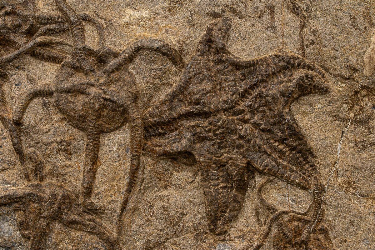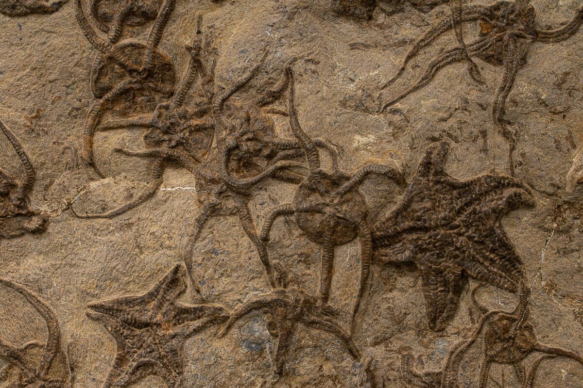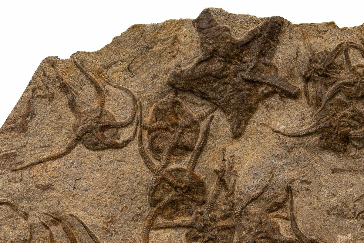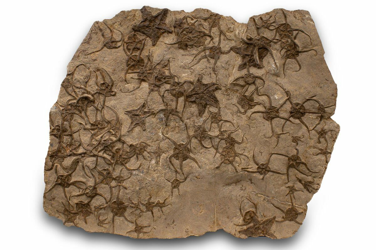 This is a very impressive 34 x 29" wide plate of fossil brittle stars and starfish from Morocco. There are over 60 brittle stars (Ophiura sp.) and 5 starfish on the piece. It is nicely prepared and restoration is less than 1% along a repaired crack through the specimen.