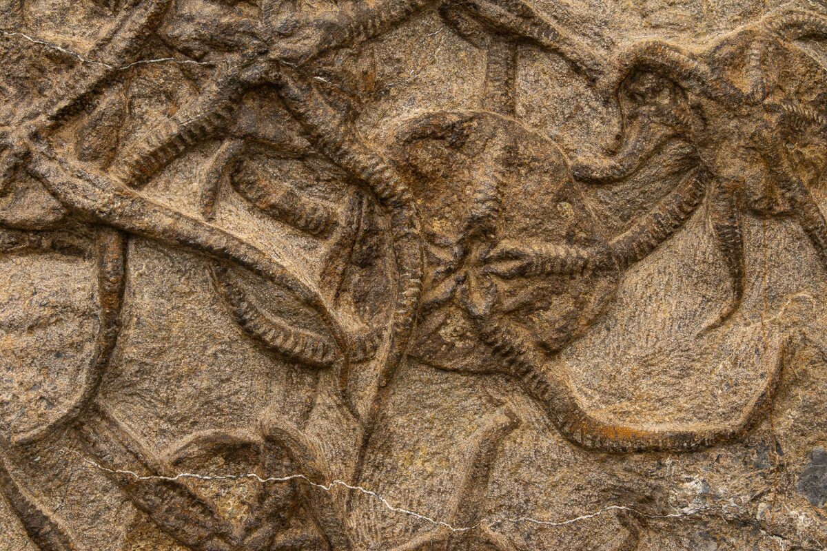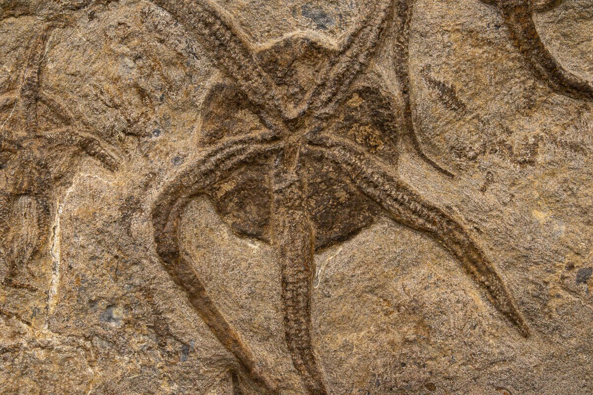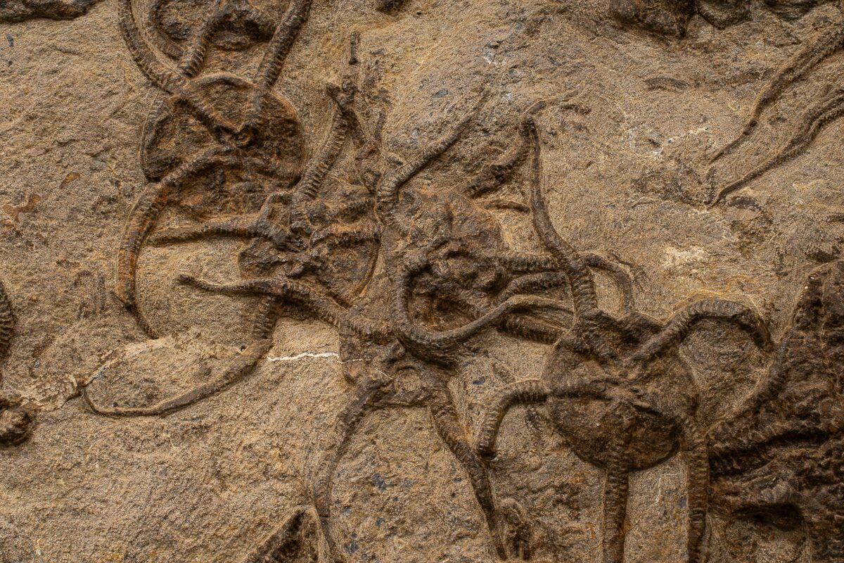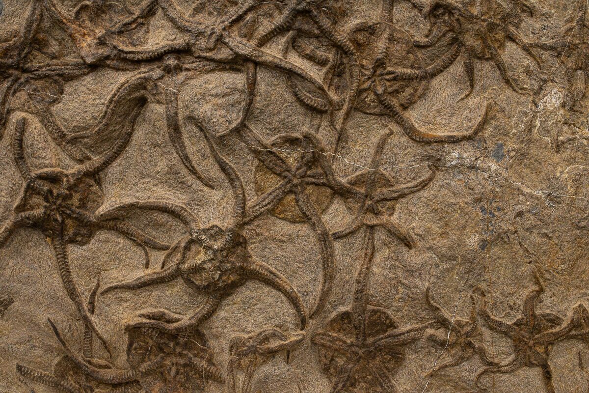 This is a very impressive 34 x 29" wide plate of fossil brittle stars and starfish from Morocco. There are over 60 brittle stars (Ophiura sp.) and 5 starfish on the piece. It is nicely prepared and restoration is less than 1% along a repaired crack through the specimen.