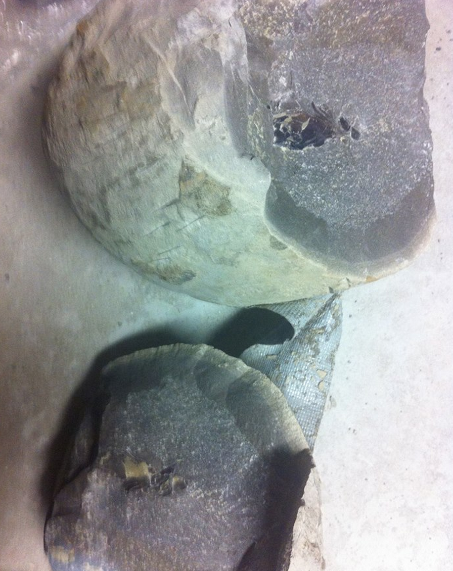 Below is an example of a Pulalius vulgaris in a concretion, after it has been broken open with a sledge hammer before preparation.