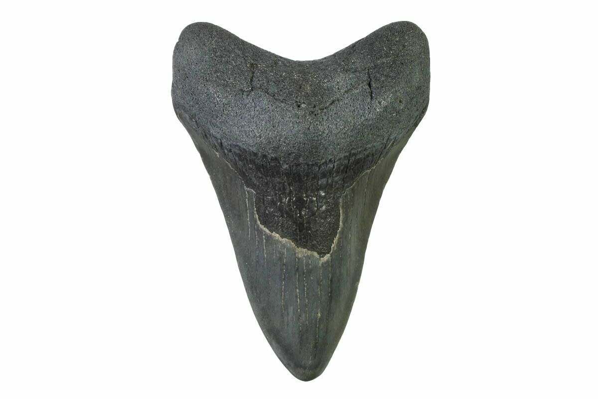 The standard measure for megalodon teeth is slant height, or the longest edge of the tooth. Adult megalodon teeth were typically in the 4 to 5 inch range: teeth over 6 inches are rare and represent super-sized individuals. Only a handful of teeth have ever been found over seven inches.
