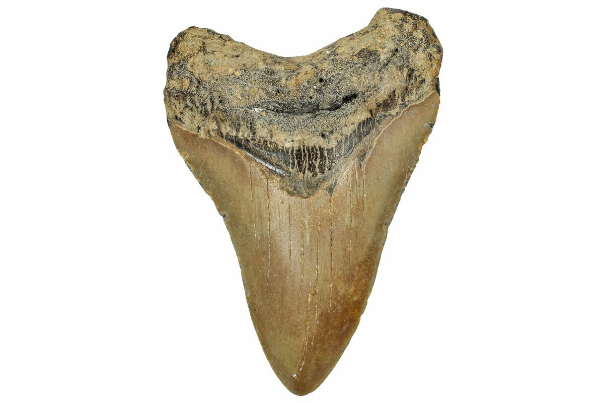 The standard measure for megalodon teeth is slant height, or the longest edge of the tooth. Adult megalodon teeth were typically in the 4 to 5 inch range: teeth over 6 inches are rare and represent super-sized individuals. Only a handful of teeth have ever been found over seven inches.