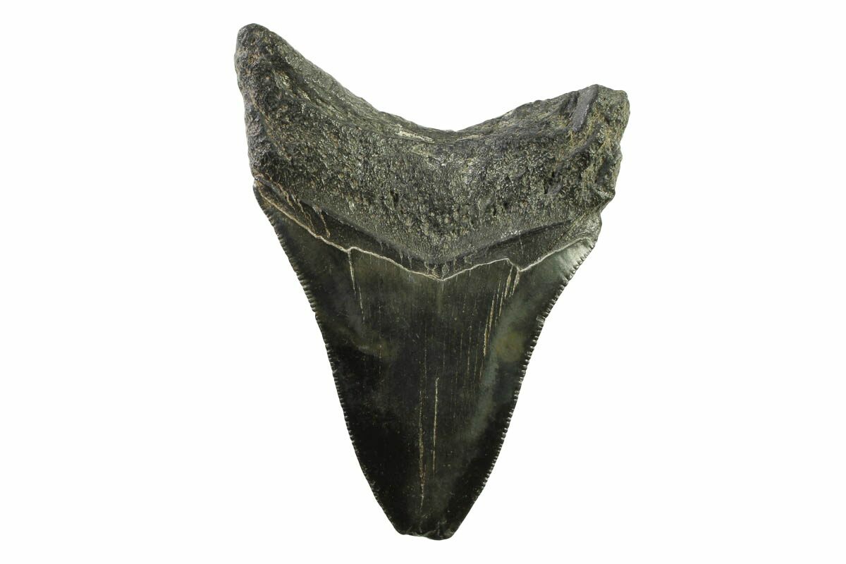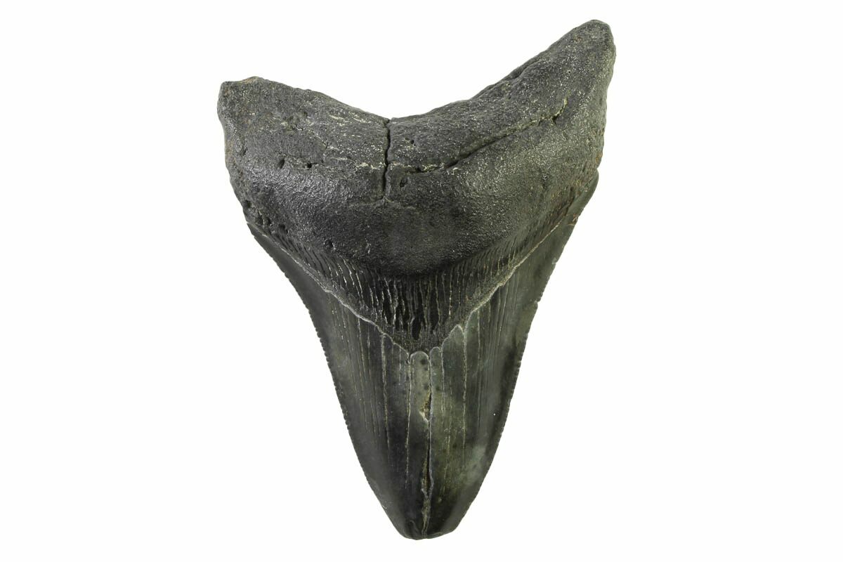 The standard measure for megalodon teeth is slant height, or the longest edge of the tooth. Adult megalodon teeth were typically in the 4 to 5 inch range: teeth over 6 inches are rare and represent super-sized individuals. Only a handful of teeth have ever been found over seven inches.