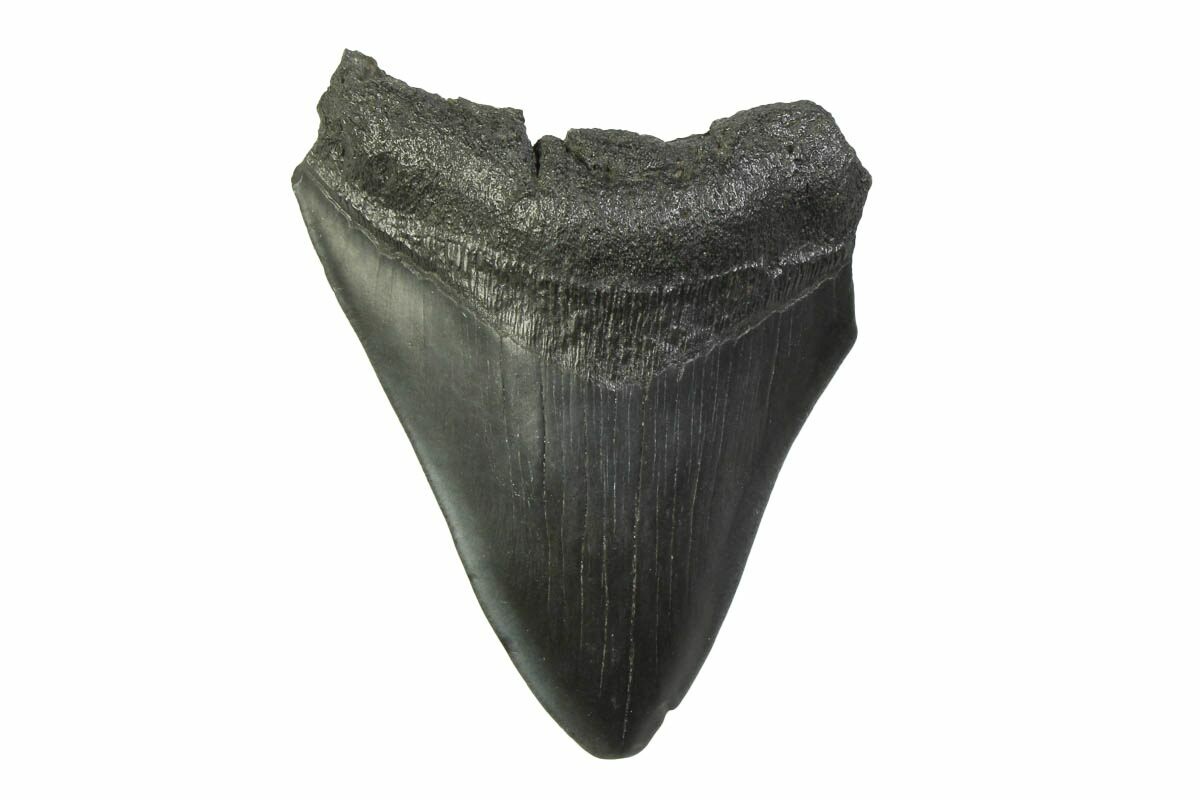 The standard measure for megalodon teeth is slant height, or the longest edge of the tooth. Adult megalodon teeth were typically in the 4 to 5 inch range: teeth over 6 inches are rare and represent super-sized individuals. Only a handful of teeth have ever been found over seven inches.