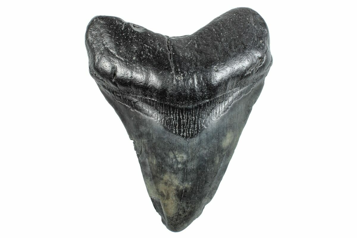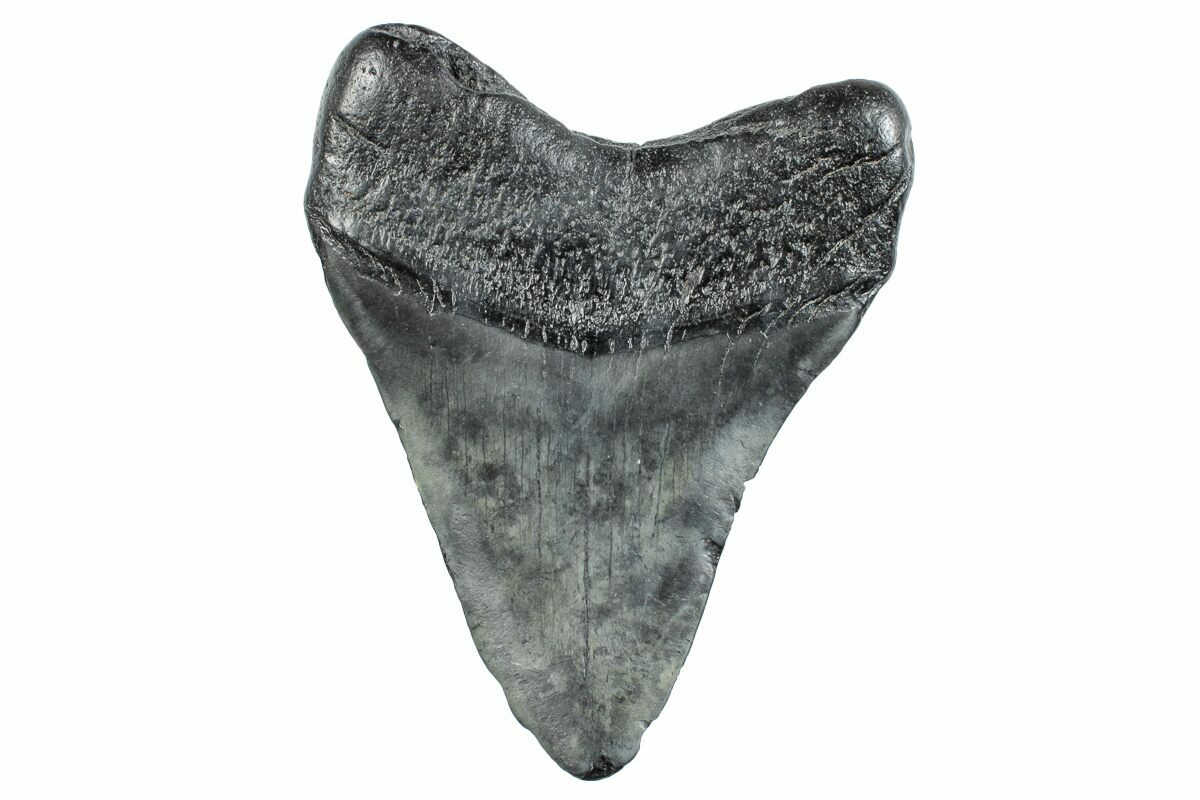 This is a 4.03" long, fossil megalodon tooth collected in South Carolina. The tooth would have come from an adult, prehistoric mega-shark in the 35+ foot size range.