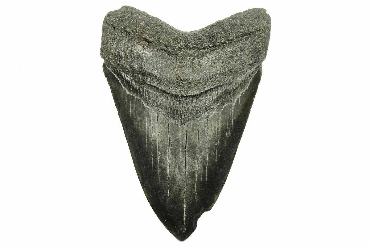 This is a 4.04" long, fossil Megalodon tooth collected in South Carolina. The tooth would have come from an adult, prehistoric, mega-shark in the 35+ foot size range.