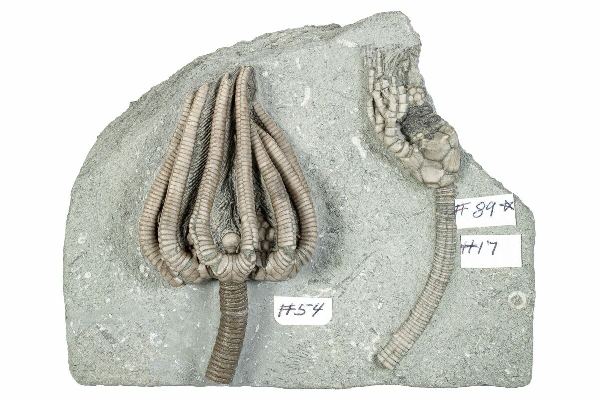 This is a beautiful, 4.05" wide plate of detailed fossil crinoids and a starfish, collected from the famous crinoid beds of Crawfordsville, Indiana. These fossils have been microscopically prepared using air abrasives, revealing their intricate details and three dimensional preservation. The two crinoids include Cyathocrinites multibrachiatus (#17 - 2.75" long including stem) and Agaricocrinus americanus (#54 - 2.7" long including stem). The starfish is of the species Onychaster flexilis and can be found at the center of the calyx of the Cyathocrinites multibrachiatus. The stem of the Agaricocrinus americanus has been mounted to the rock.