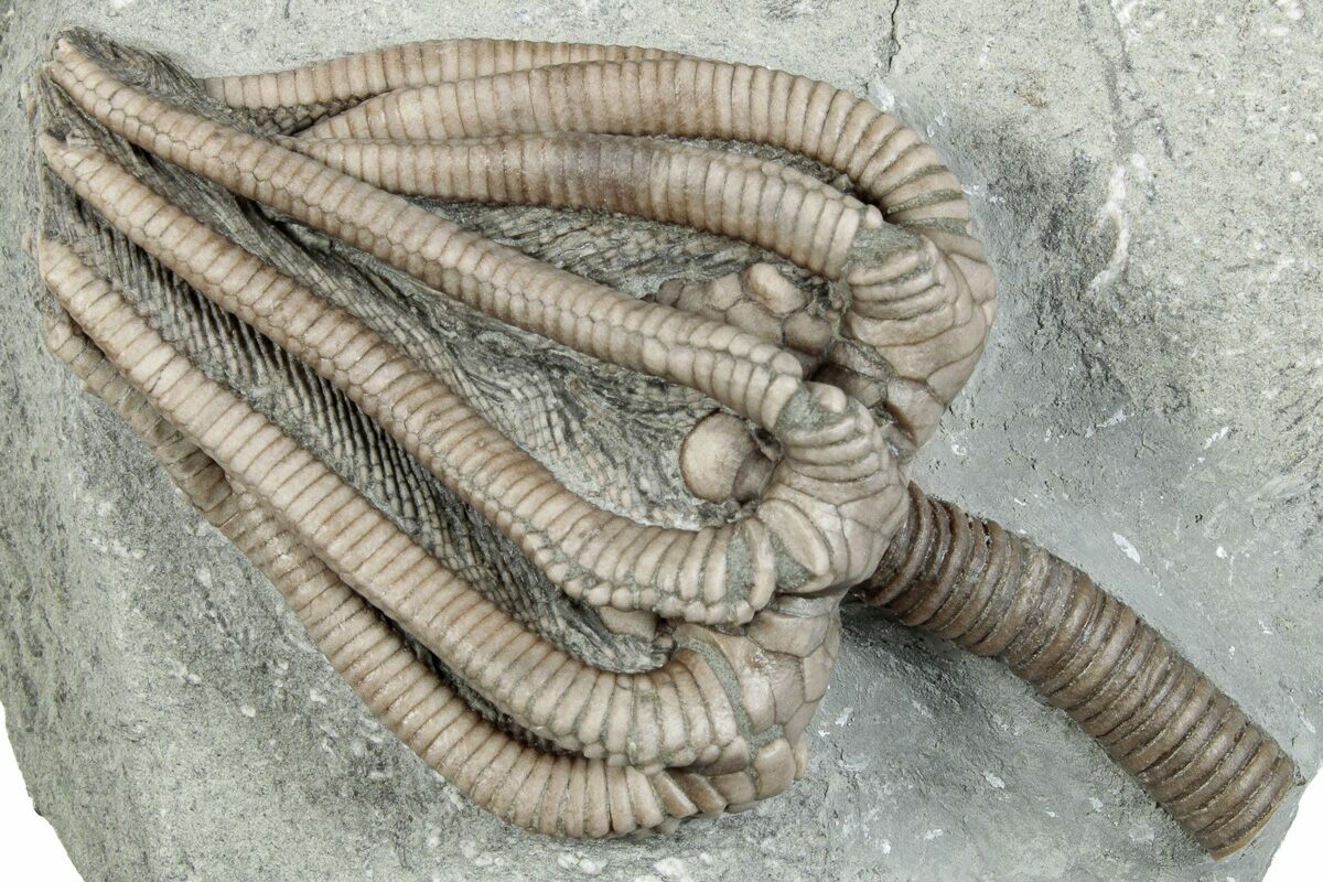 Crinoids from the Ramp Creek Limestone were likely buried in sediment from nearby deltas during storms. The resulting siltstone deposits are soft enough that fossils can be extracted in exquisite, three-dimensional relief.