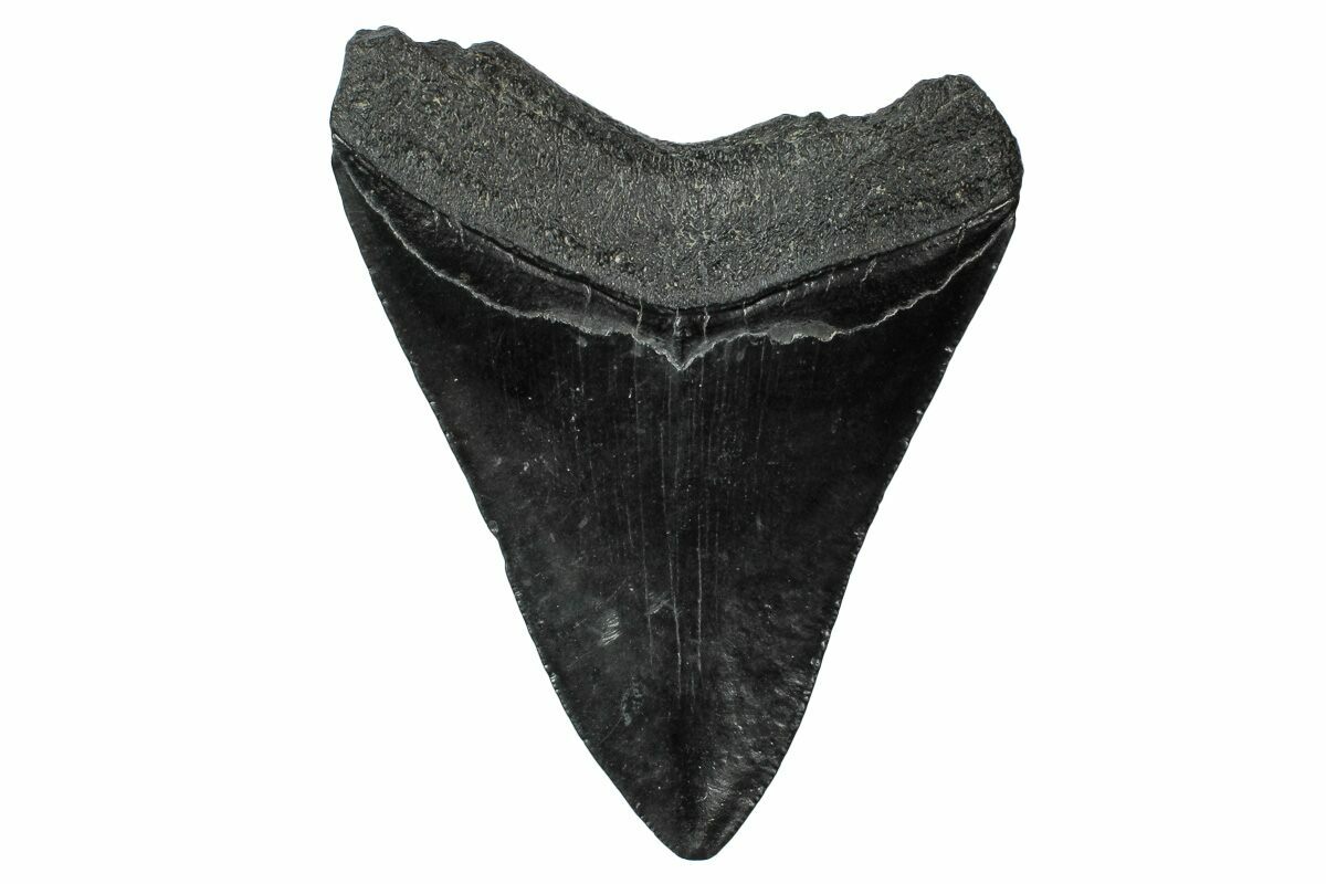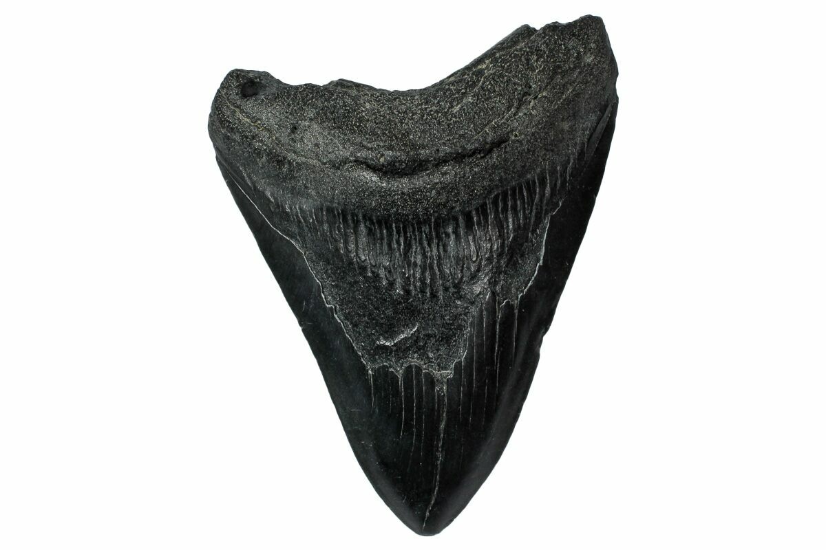 The standard measure for megalodon teeth is slant height, or the longest edge of the tooth. Adult megalodon teeth were typically in the 4 to 5 inch range: teeth over 6 inches are rare and represent super-sized individuals. Only a handful of teeth have ever been found over seven inches.