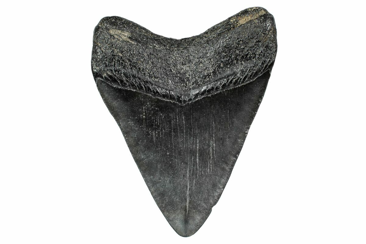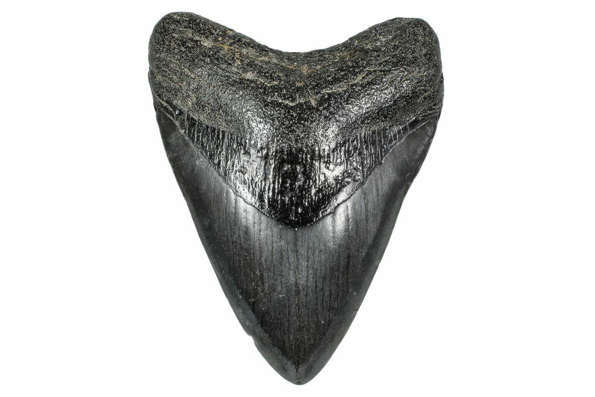 This is a 4.07" long fossil megalodon tooth collected from the Savannah River area along the border of Georgia and South Carolina. The tooth would have come from an adult, prehistoric, mega-shark in the 35+ foot size range.