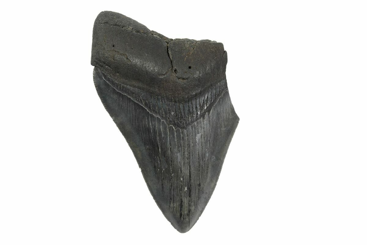 The standard measure for megalodon teeth is slant height, or the longest edge of the tooth. Adult megalodon teeth were typically in the 4 to 5 inch range: teeth over 6 inches are rare and represent super-sized individuals. Only a handful of teeth have ever been found over seven inches.