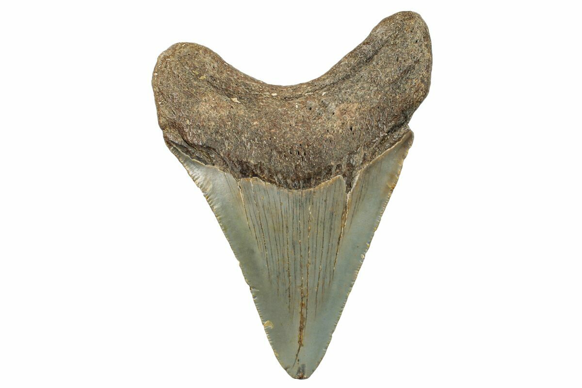 This is a 4.08" long megalodon tooth collected on the North Carolina coast. It was found by commercial divers collecting "the ledges" in about 100 feet of water. It would have eroded out of the Pungo River Formation, putting its age in the range of 13.8 to 16 million years old. A tooth of this size would have come from a prehistoric mega-shark in the 30+ foot size range.