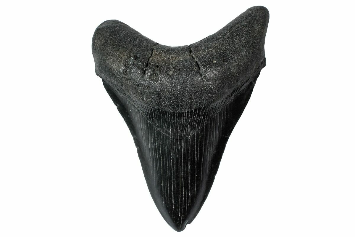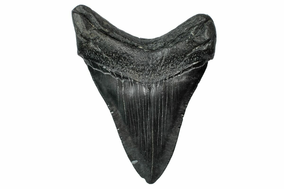 The standard measure for megalodon teeth is slant height, or the longest edge of the tooth. Adult megalodon teeth were typically in the 4 to 5 inch range: teeth over 6 inches are rare and represent super-sized individuals. Only a handful of teeth have ever been found over seven inches.