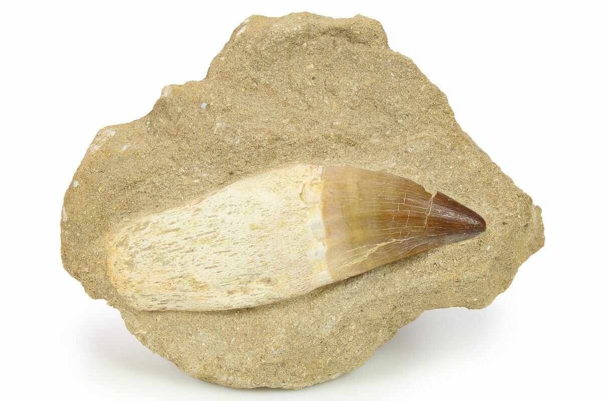 4.09" Rooted Mosasaur (Prognathodon) Tooth In Rock - Morocco