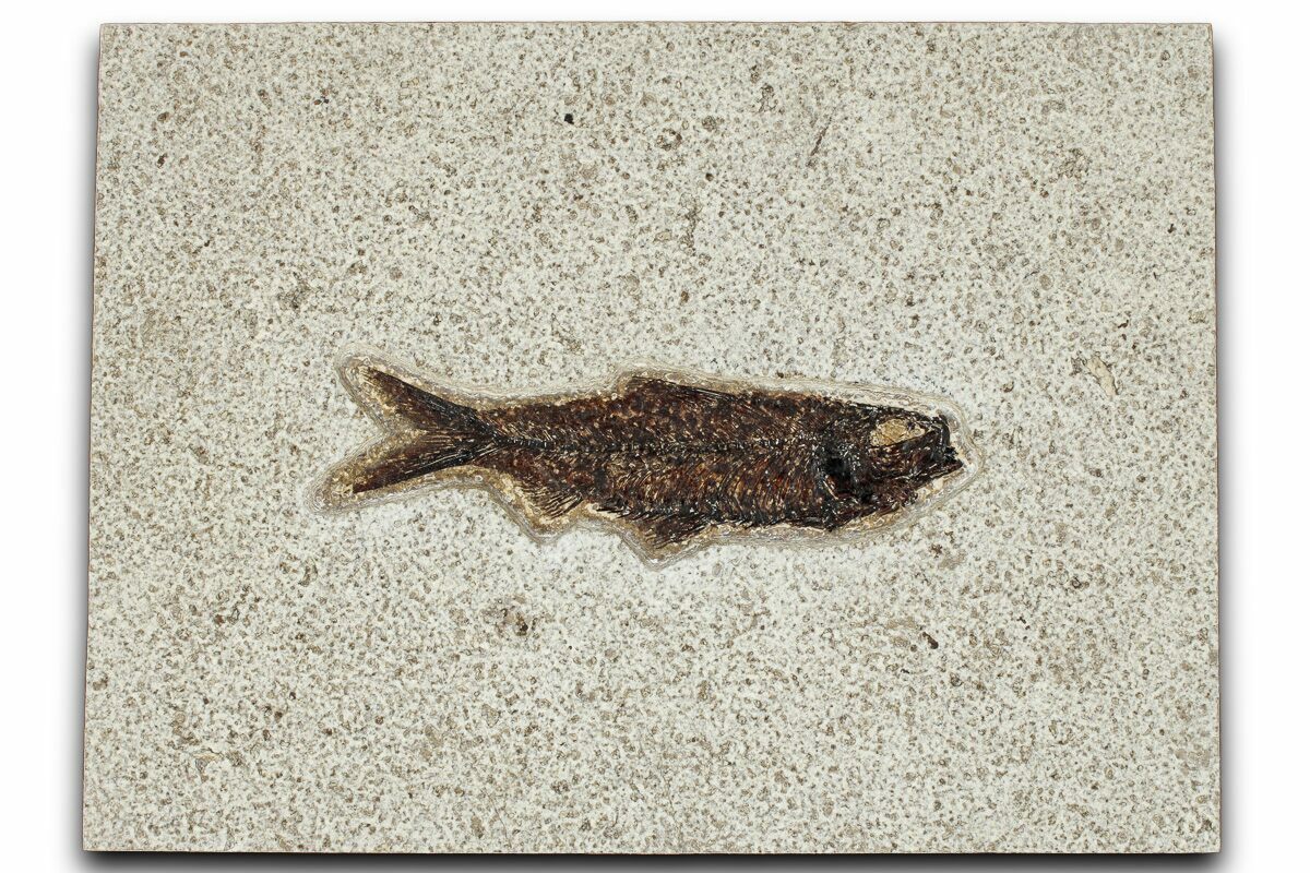 This is a nicely preserved 4.1" long fossil fish (Knightia eocaena) from the Eocene-aged Green River Formation in Wyoming. It comes out of the 18 inch layer which produces beautifully preserved fish, but takes 2-3x longer to prep. It is well-detailed and prepared with bone structure, fins, and scale structure visible. The fish is nicely centered on a rectangular cut slab of rock