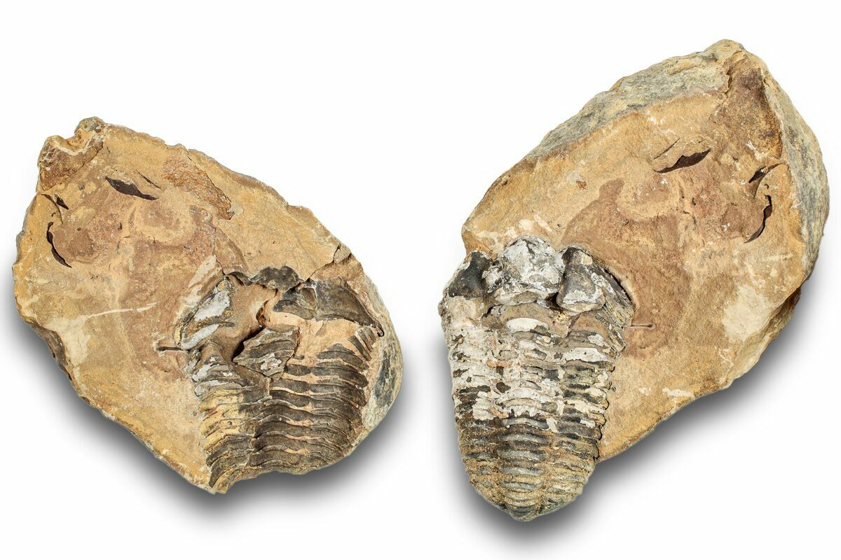 This is a 3D trilobite (Calymene) nodule from the Anti-Atlas Region of Morocco. These trilobites are preserved as internal molds within the sandstone formation and are fairly common, making them a very inexpensive trilobite fossil for their size. This Calymene trilobite is accompanied by the negative portion of its nodule from which it was contained. They have often been referred to as Flexicalymene ouzregui but the genus and/or species names are, as yet, still being debated.