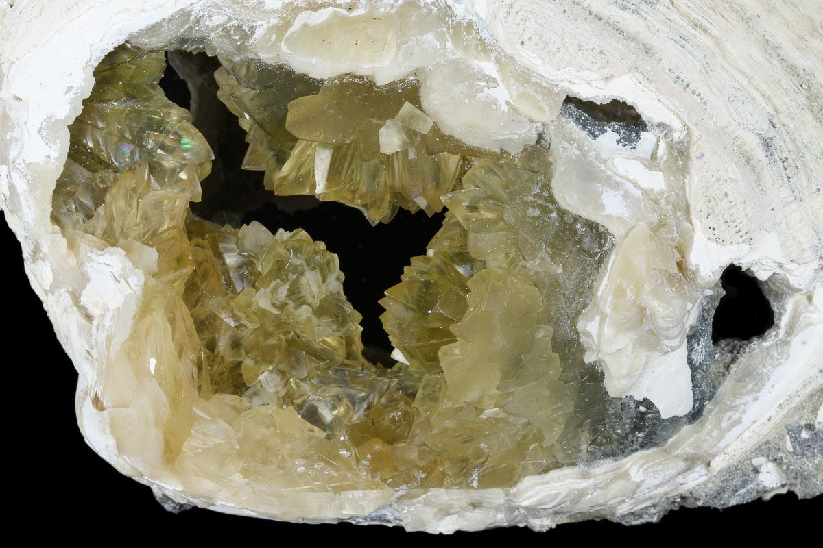 Fossils from Rucks Pit, located near Fort Drum in central Florida, are famed for their stunning preservation and unique appearance. The site, once part of an ancient shallow sea, is best known for its fossilized clam shells (Mercenaria permagna) from the Pleistocene epoch—roughly 1.5 to 2 million years old. These fossil clams often contain beautiful golden-yellow calcite crystals, formed when mineral-rich groundwater permeated the shells and deposited crystalline calcite in the hollow interiors. The striking contrast between the rough, weathered shell and the sparkling crystal interior makes them highly sought after by collectors.