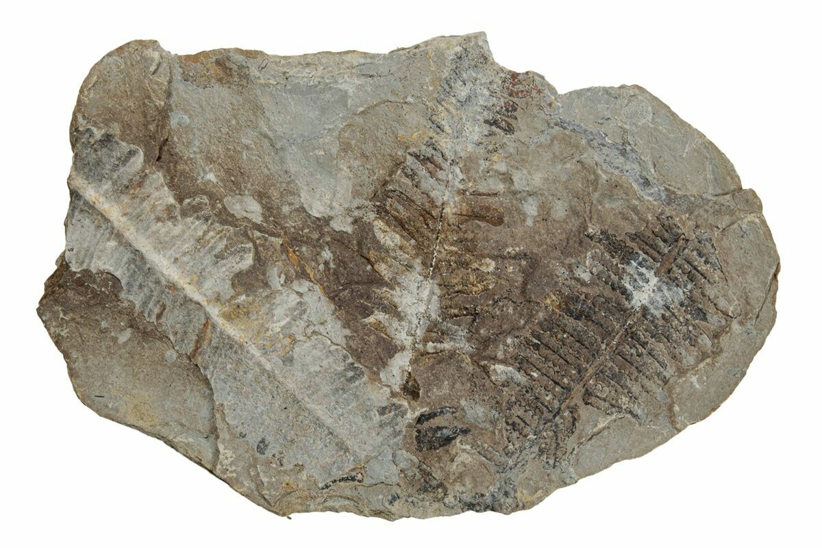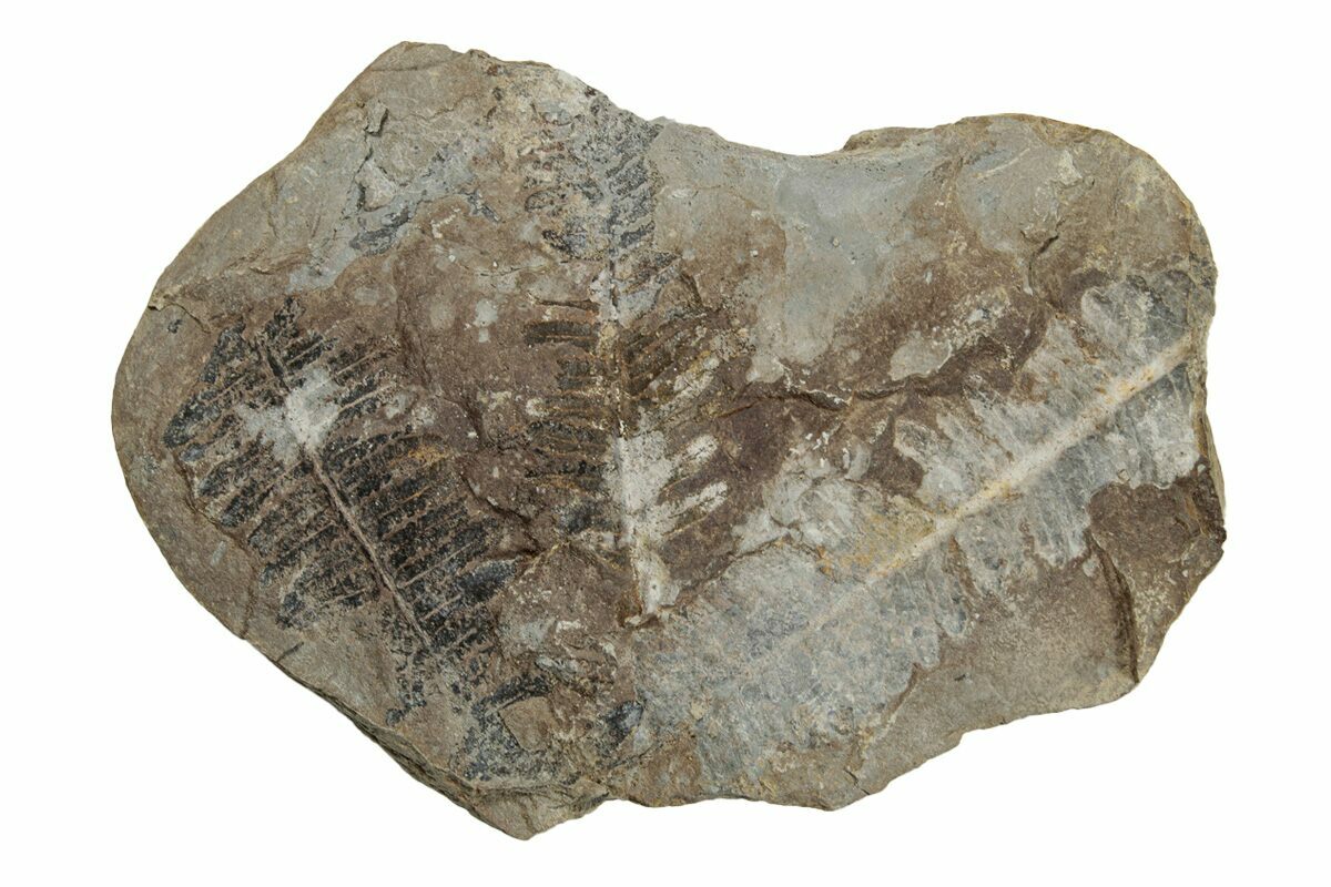 This is a 4.1" fern fossil (Pecopteris sp.) from the Carbondale Formation (Francis Creek Shale) in Illinois. It is preserved inside an ironstone nodule associated with the famous Mazon Creek Lagerstätte. Under magnification the detail of this specimen stands out. Both the positive (convex) and negative (concave) sides of the fossil nodule are included along with a pair of display stands.