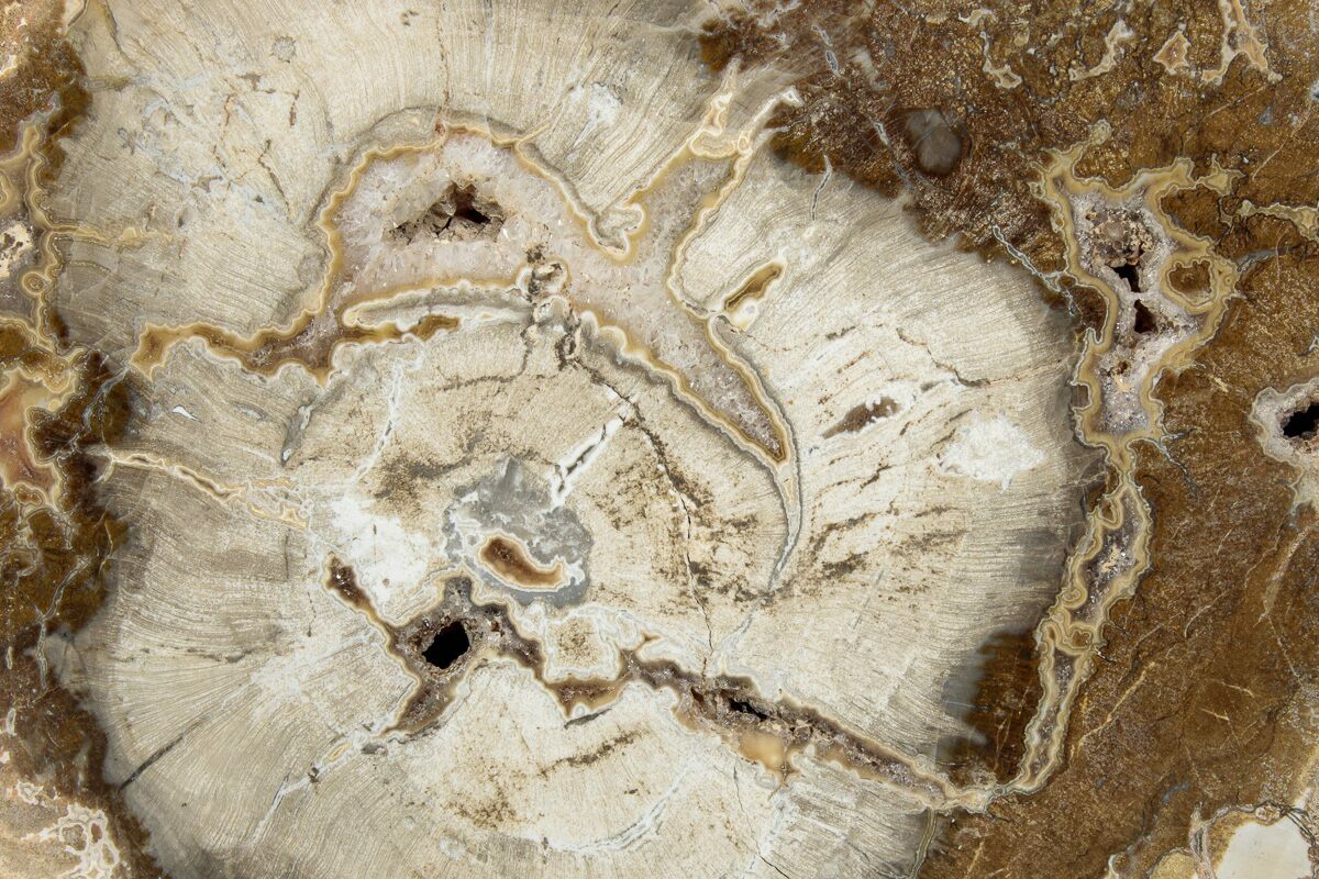 Madagascar petrified wood comes primarily from extensive Triassic-aged deposits in the Mahajanga Basin of northwestern Madagascar, where ancient conifer forests—often attributed to species related to Araucarioxylon—were buried by volcanic ash and floodplain sediments roughly 225–240 million years ago. Over immense spans of time, silica-rich fluids percolated through these sediments, replacing the cellular structure of the wood with chalcedony, jasper, agate, and quartz while preserving growth rings, bark textures, and even microscopic details. The region’s unique geochemistry—especially its iron, manganese, and occasionally copper content—produces the vivid palette Madagascar petrified wood is famous for, including deep brick reds, golden yellows, smoky blacks, and pastel pinks. Many logs are found fully silicified and naturally fractured into large, rounded segments that local artisans cut into slabs, spheres, eggs, and freeforms. These deposits stretch across arid badlands where erosion steadily exposes new material, making Madagascar one of the world’s premier sources of highly colorful, beautifully patterned fossil wood.