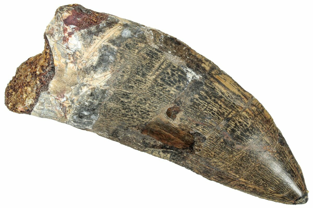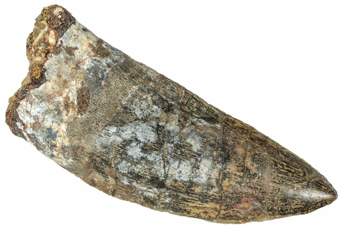 huge is a massive, serrated, 4.11" long tooth of a Carcharodontosaurus from the Late Cretaceous, Kem Kem Beds of Morocco. Carcharodontosaurus was an enormous predatory dinosaur larger than Tyrannosaurus rex.