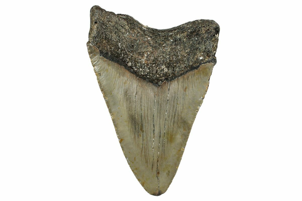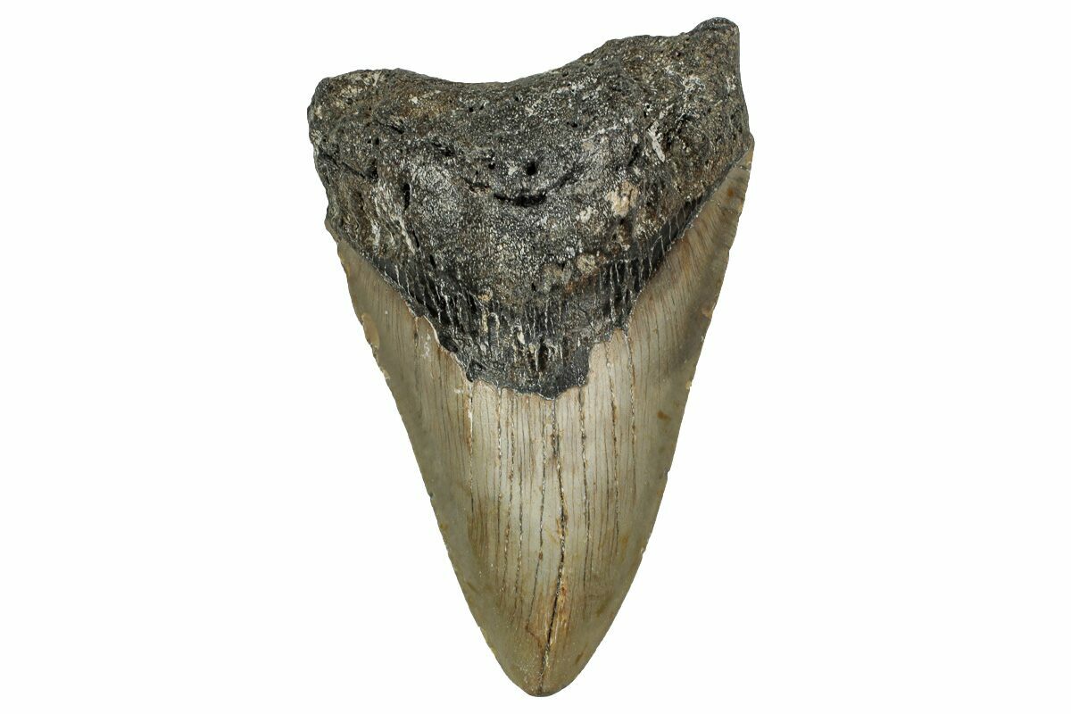This is a 4.14" long megalodon tooth collected on the North Carolina coast. It was found by commercial divers collecting "the ledges" in about 100 feet of water. It would have eroded out of the Pungo River Formation, putting its age in the range of 13.8 to 16 million years old. A tooth of this size would have come from a prehistoric, mega-shark in the 35+ foot size range.
