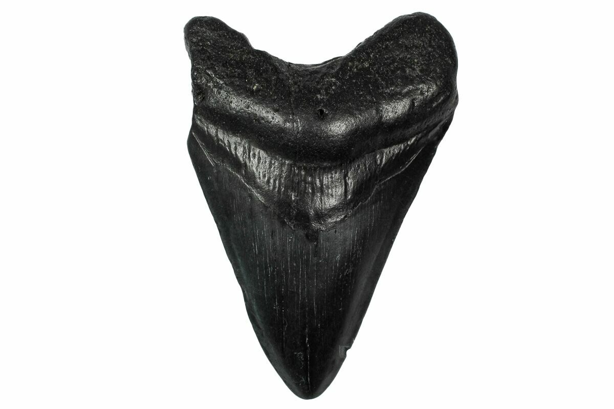 The standard measure for megalodon teeth is slant height, or the longest edge of the tooth. Adult megalodon teeth were typically in the 4 to 5 inch range: teeth over 6 inches are rare and represent super-sized individuals. Only a handful of teeth have ever been found over seven inches.