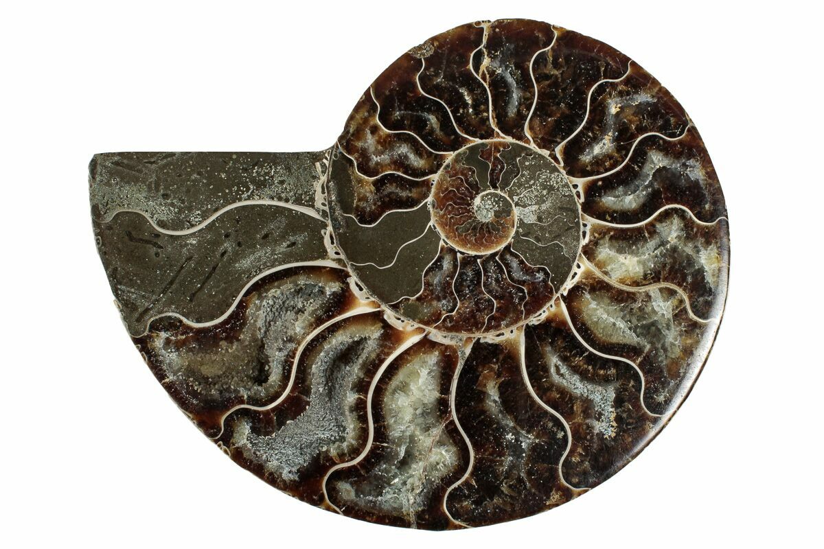 Here is a beautiful, 4.15" wide, cut and polished Cleoniceras ammonite fossil from Madagascar. These ammonites are Cretaceous in age, approximately 110 million years old. This specimen exhibits gorgeous mineralization within the chambers, each separated by white calcite septa (divisions). This highly polished, exotic ammonite makes a superb display piece with tremendous historical appeal.