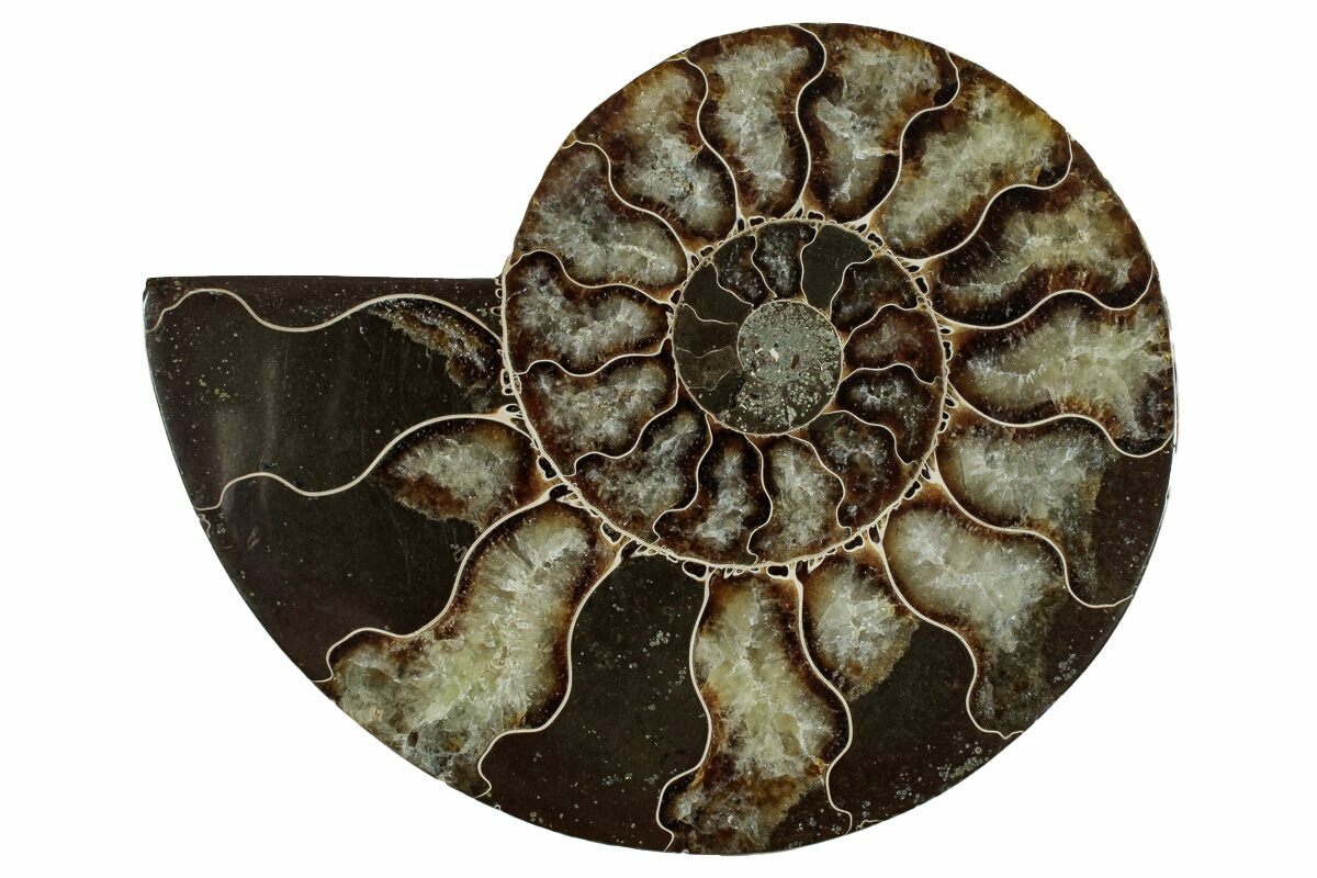 Here is a beautiful, 4.15" wide, cut and polished Cleoniceras ammonite fossil from Madagascar. These ammonites are Cretaceous in age, approximately 110 million years old. This specimen exhibits gorgeous mineralization within the chambers, each separated by white calcite septa (divisions). This highly polished, exotic ammonite makes a superb display piece with tremendous historical appeal.
