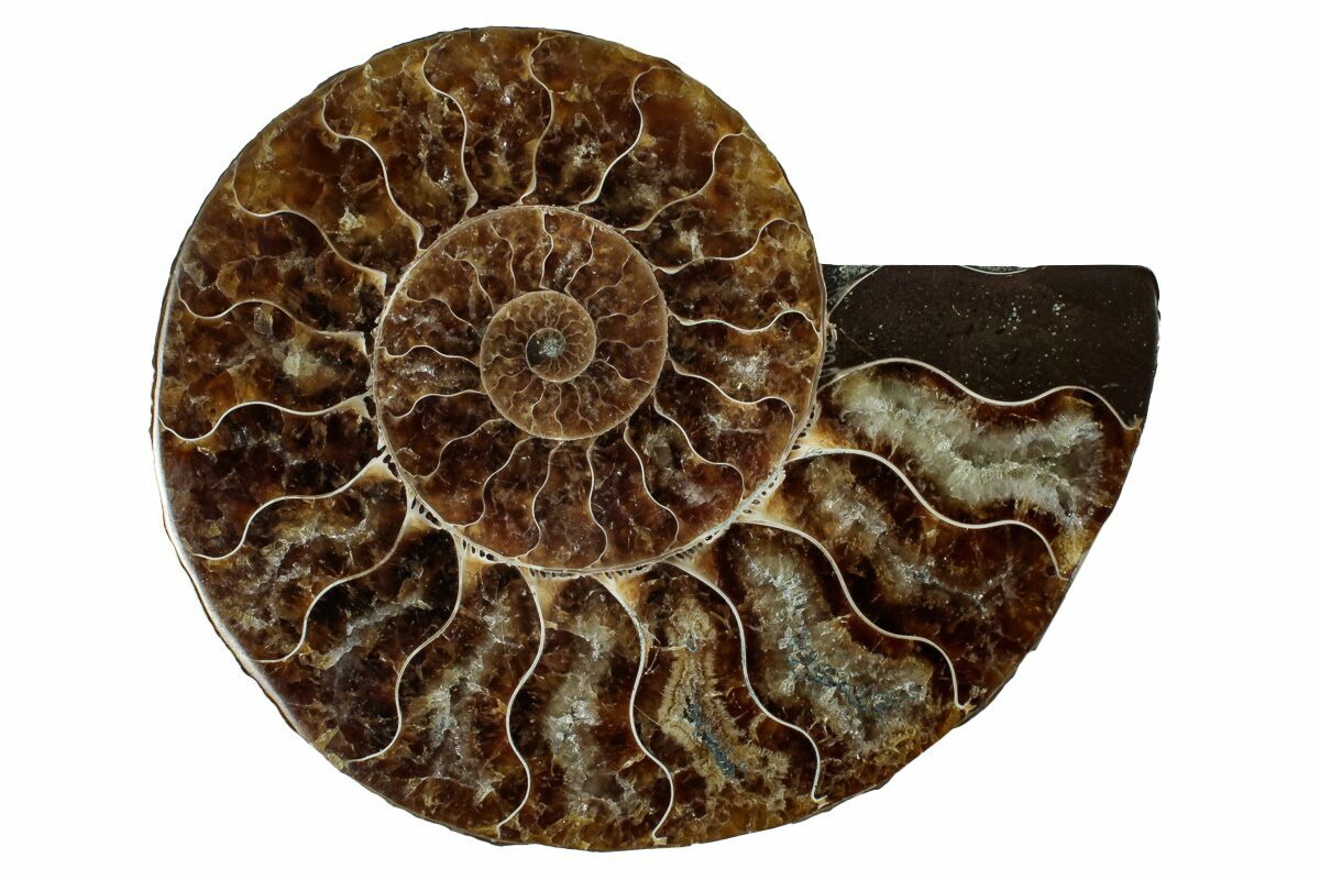 Here is a beautiful, 4.15" wide, cut and polished Cleoniceras ammonite fossil from Madagascar. These ammonites are Cretaceous in age, approximately 110 million years old. This specimen exhibits gorgeous mineralization within the chambers, each separated by white calcite septa (divisions). This highly polished, exotic ammonite makes a superb display piece with tremendous historical appeal.