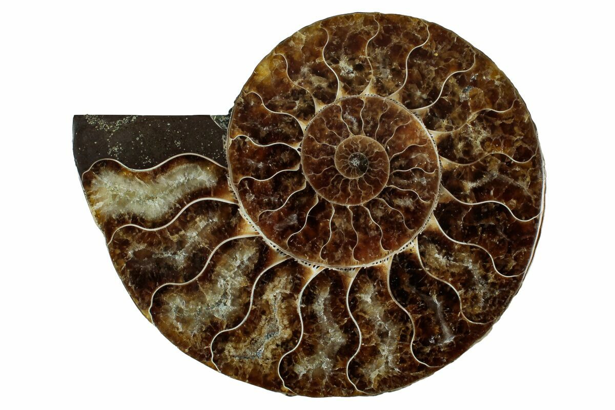 Here is a beautiful, 4.15" wide, cut and polished Cleoniceras ammonite fossil from Madagascar. These ammonites are Cretaceous in age, approximately 110 million years old. This specimen exhibits gorgeous mineralization within the chambers, each separated by white calcite septa (divisions). This highly polished, exotic ammonite makes a superb display piece with tremendous historical appeal.
