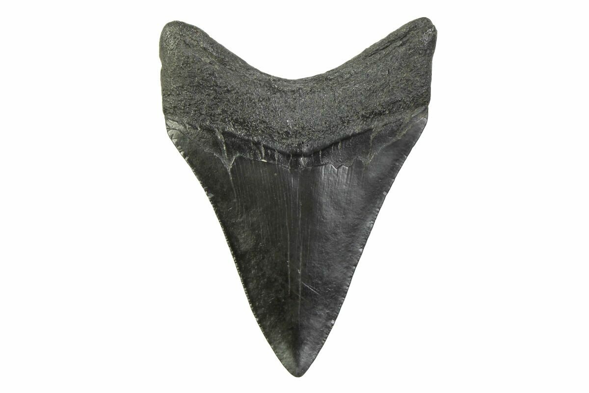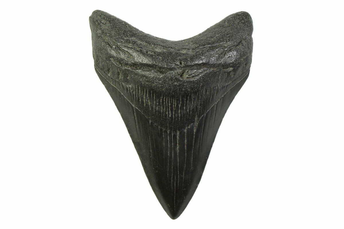 The standard measure for megalodon teeth is slant height, or the longest edge of the tooth. Adult megalodon teeth were typically in the 4 to 5 inch range: teeth over 6 inches are rare and represent super-sized individuals. Only a handful of teeth have ever been found over seven inches.