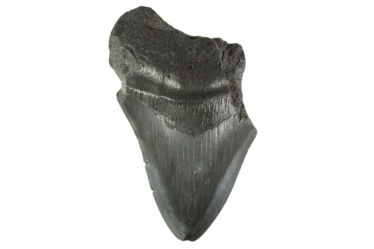 This is a partial, 4.15" long fossil megalodon tooth collected from a river in South Carolina. The tooth would have come from an adult, prehistoric, mega-shark in the 35+ foot size range.