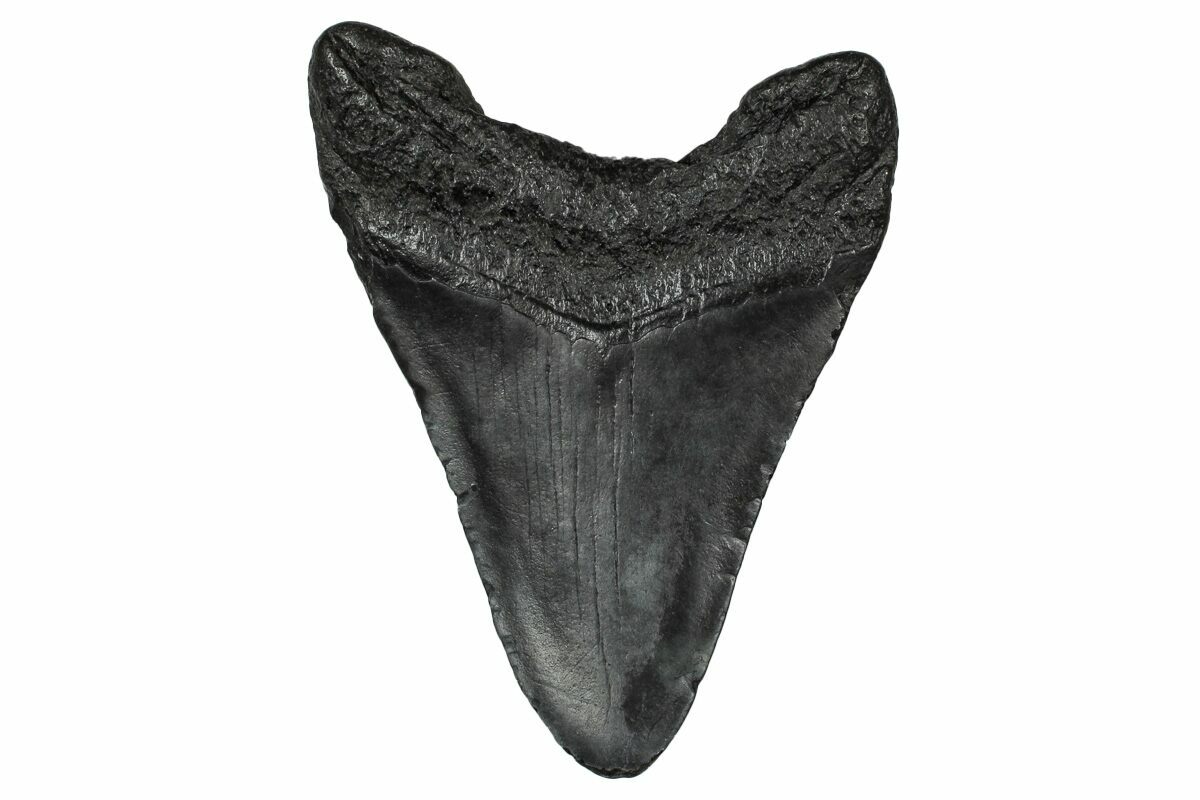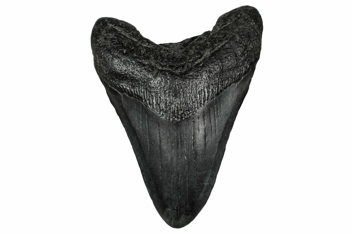 This is a 4.19" long, fossil megalodon tooth collected in South Carolina. The tooth would have come from an adult, prehistoric, mega-shark in the 35+ foot size range.