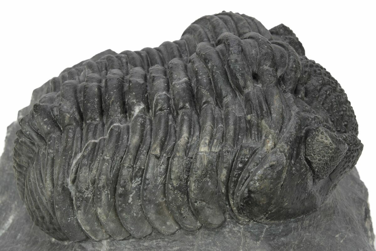 Drotops is a genus of large Phacopid trilobites found in Morocco. The genus includes two species: Drotops megalomanicus, known for its smoother exoskeleton, and Drotops armatus, distinguished by its spiny armor. Renowned for their impressive size, these trilobites can reach lengths of up to seven inches, with most specimens ranging between four and five inches.