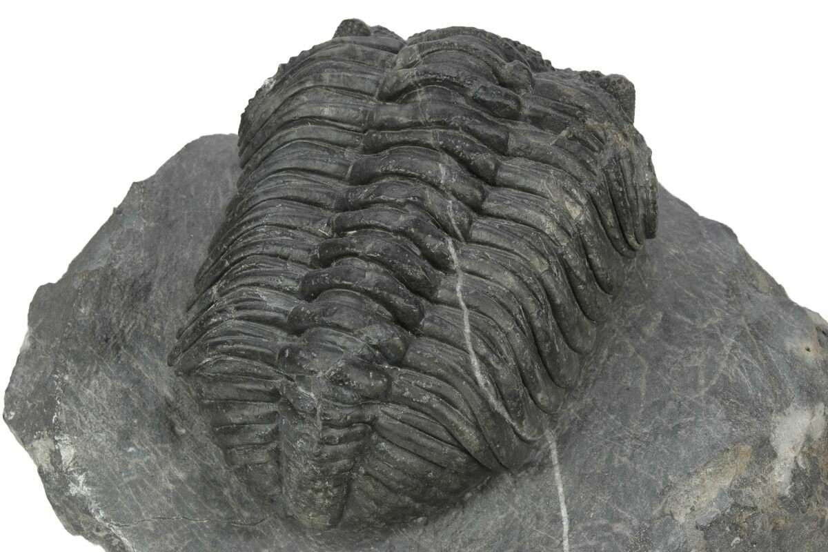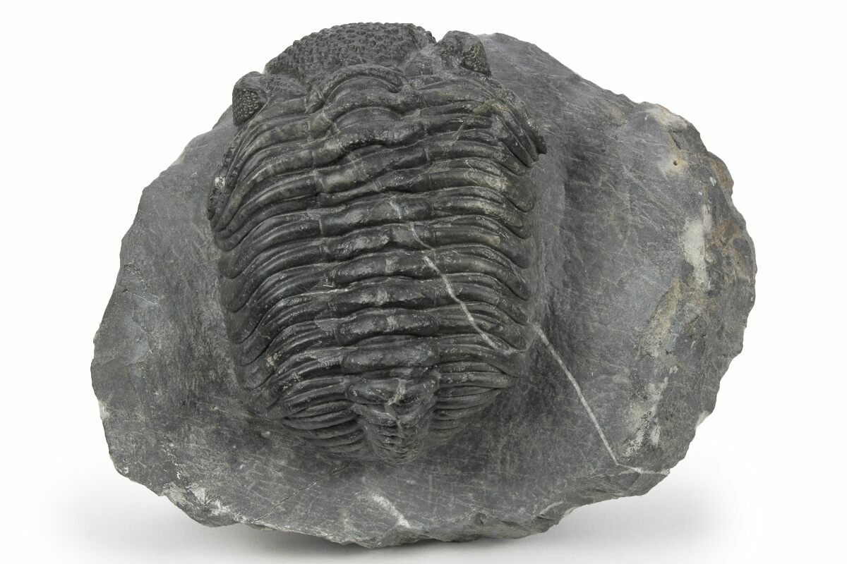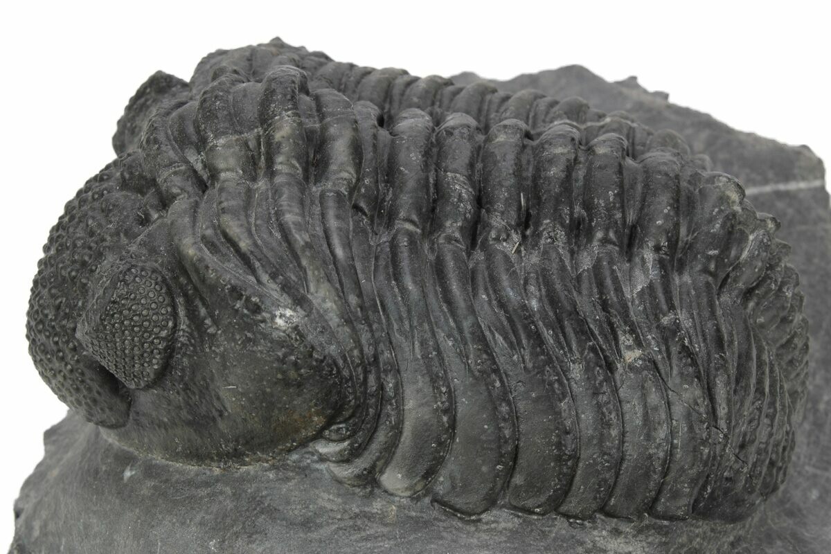 This is a large Drotops megalomanicus trilobite collected near Issoumour, Morocco. The head and tail are a bit tucked but it would be about 4.2" long if outstretched. Good eye facet detail in both eyes and no restoration.