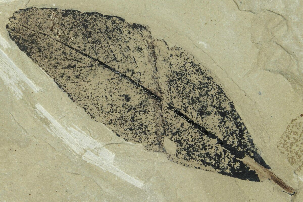 This is a 4.2" wide slab of shale containing two fossil leaves, each on opposite sides of the rock. The largest (2.1" long including stem) is a leaf of the species Cedrelospermum nervosum; a species of plant classified within the Ulmaceae family, which includes modern trees like elm and hackberry. The smaller leaf on the back side of the rock is of the species Leguminosites lesquereuxiana, a type of legume. This specimen was collected from the Green River Formation in Utah.