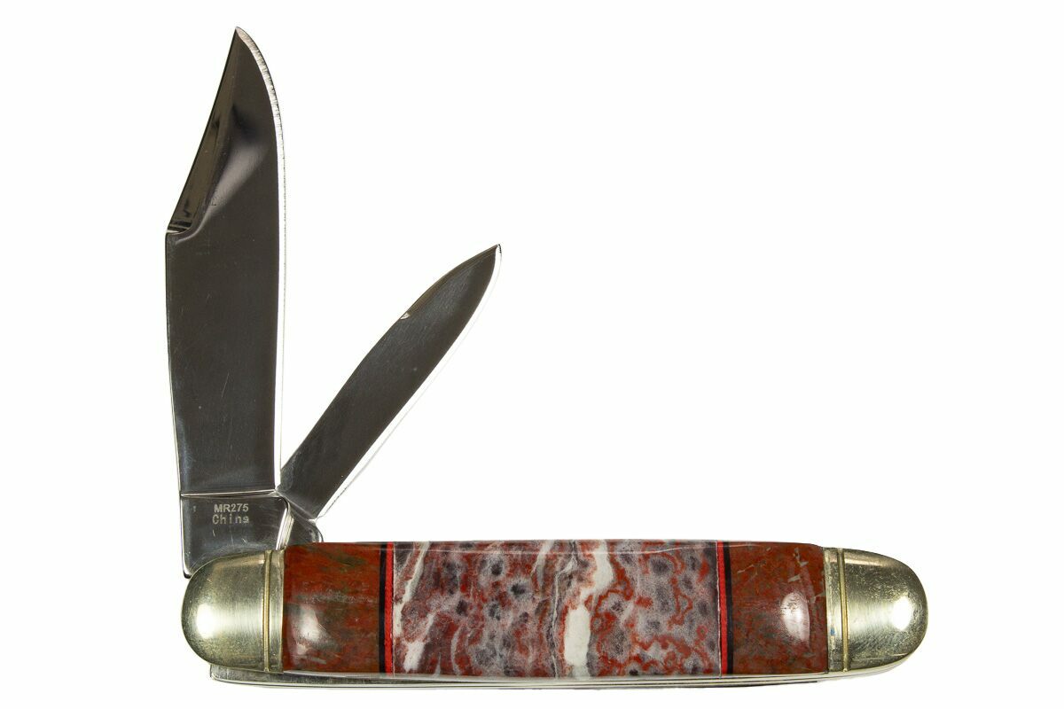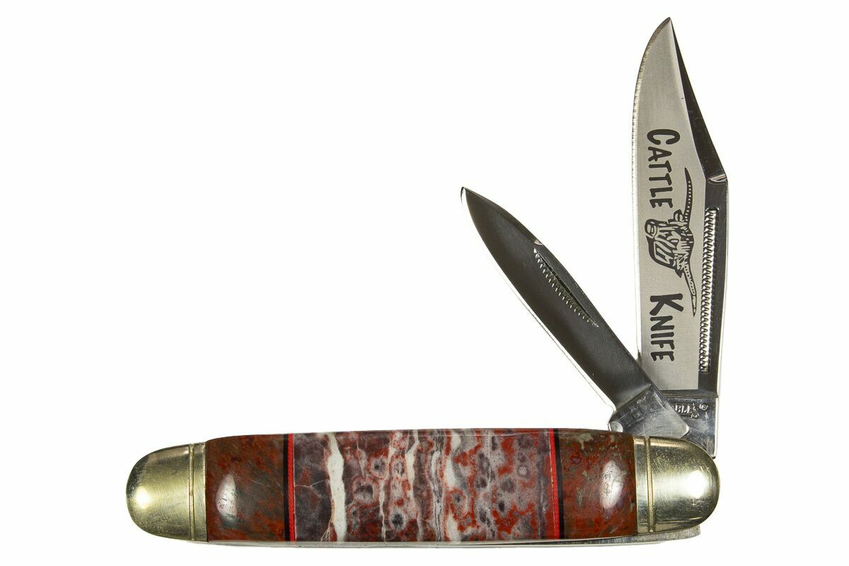 This high-quality pocket knife is a stunning blend of natural history and functional artistry. Handcrafted in Utah, it features a handle made from genuine red dinosaur gembone sourced from the Morrison Formation, dating back approximately 150 million years to the Late Jurassic period. The fossilized bone is polished to reveal vivid red hues and intricate, cell-like structure, making each knife a unique and eye-catching work of art.