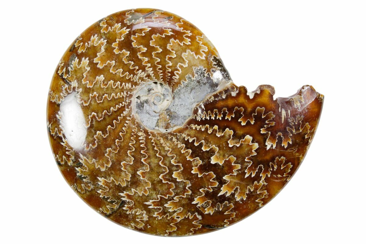 This is a 4.2" wide polished ammonite of the genus Cleoniceras, collected in Madagascar. It is absolutely gorgeous, displaying a distinctive "oak-leaf" suture pattern on the surface. This 110 million year old ammonite is truly a natural work of art, with the end chamber having been exposed/cleaned.