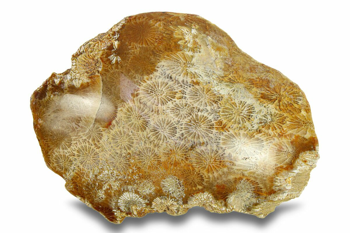 This is a beautiful polished section of fossil coral from Sumatra, Indonesia. The polishing reveals the coral's beautiful fossilized structures. this coral has been polished on one side; the rest of the specimen is left in its rough state.